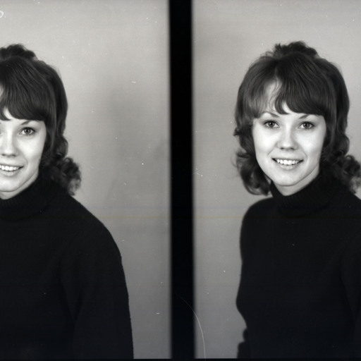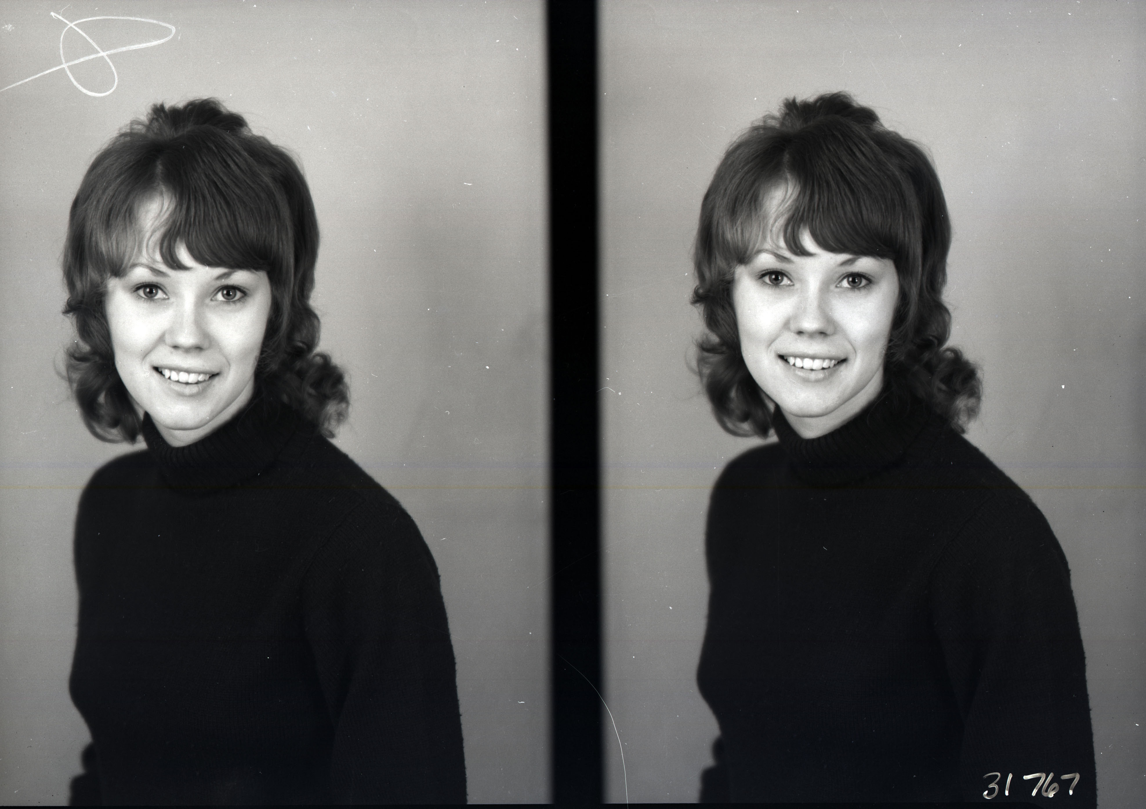 Photo of two separate portrait photographs of the same unidentified young woman with short hair, bangs, and wearing a turtleneck sweater.