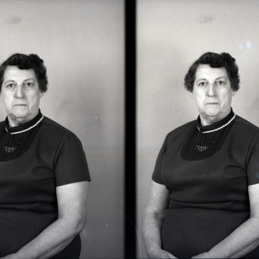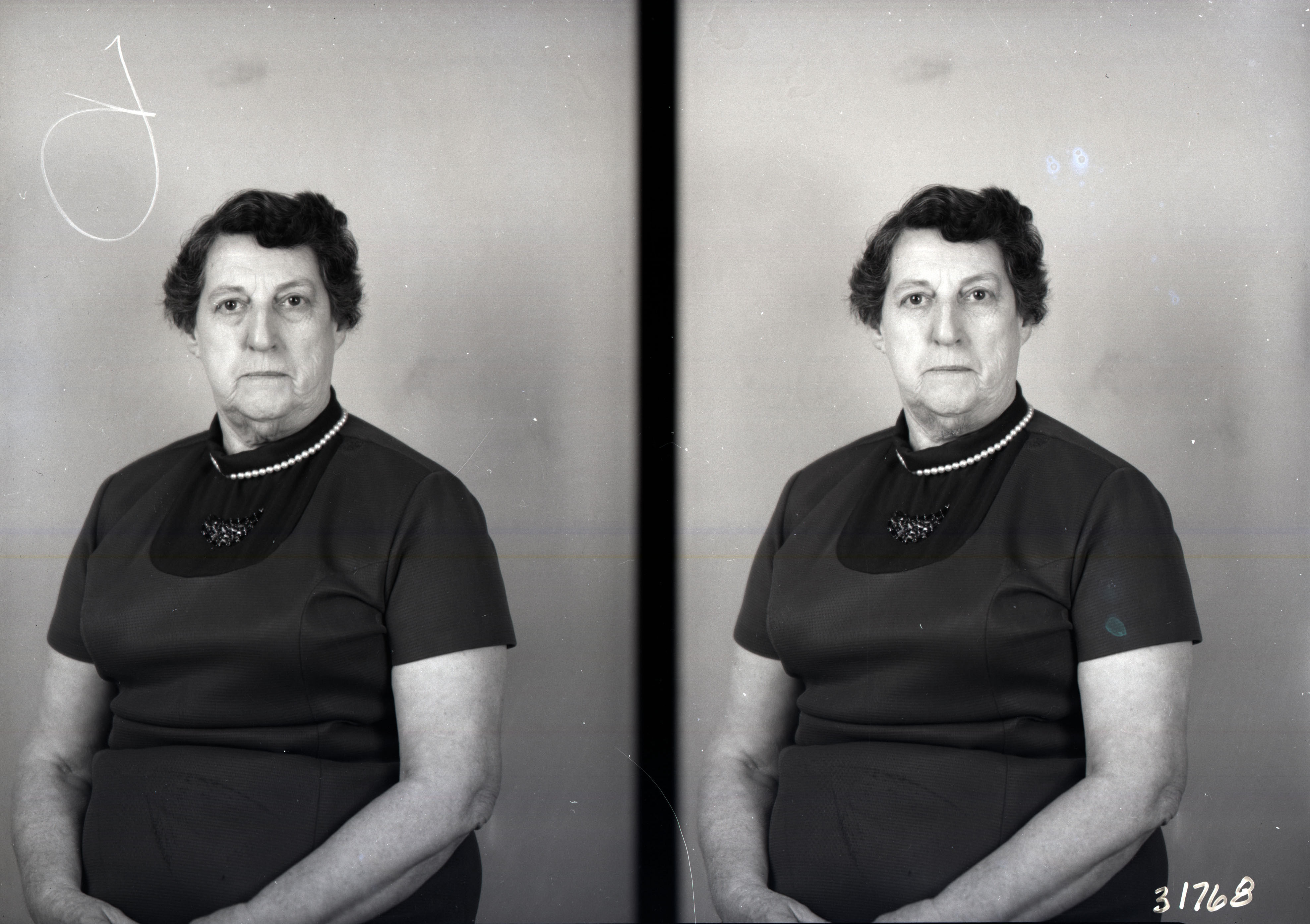 Photo of two separate portrait photographs of the same unidentified woman with short hair and wearing a short-sleeved dress.