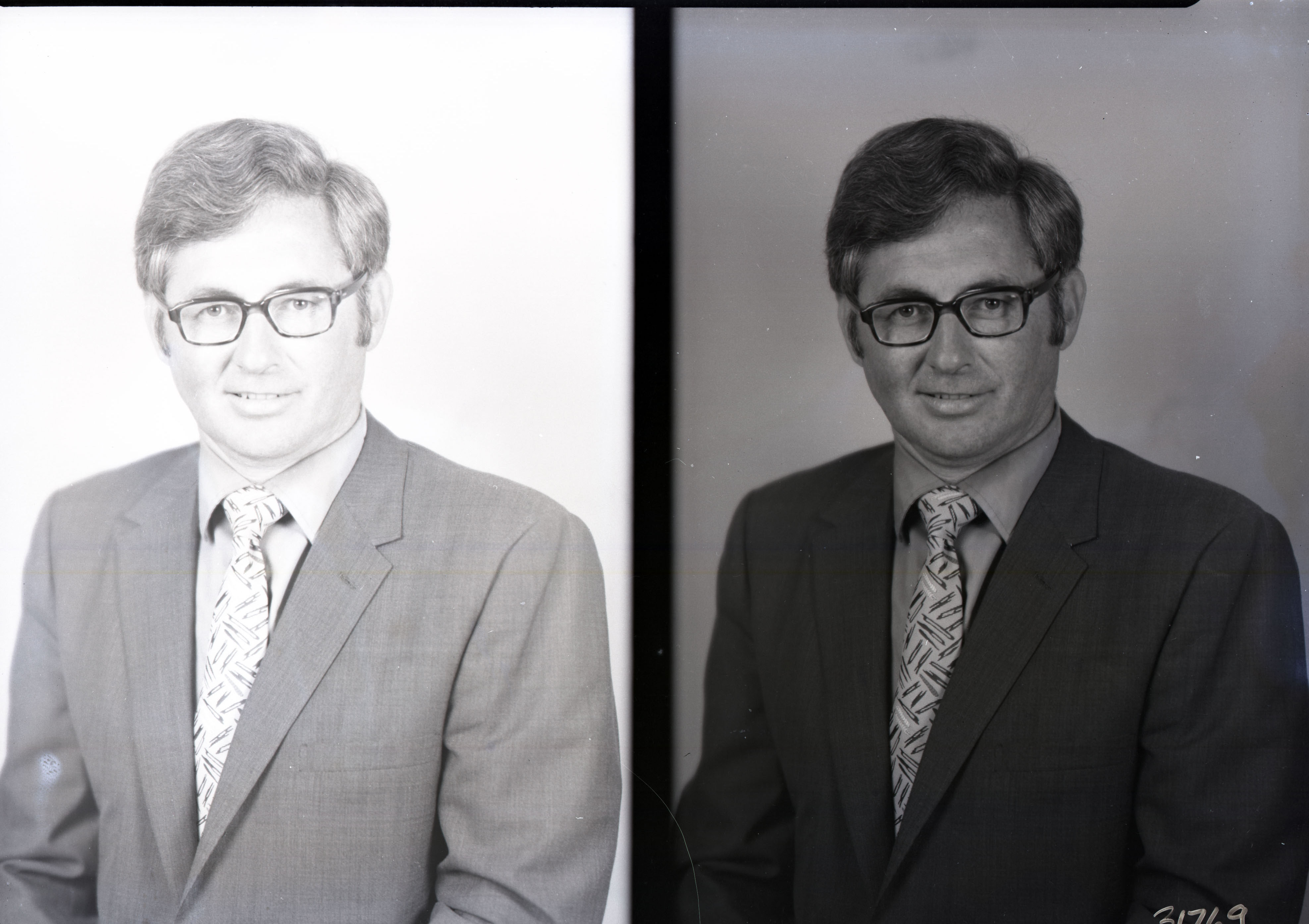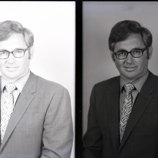 Photo of two separate portrait photographs of the same unidentified man with glasses and wearing a suit and patterned tie.