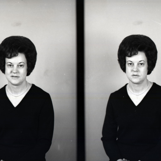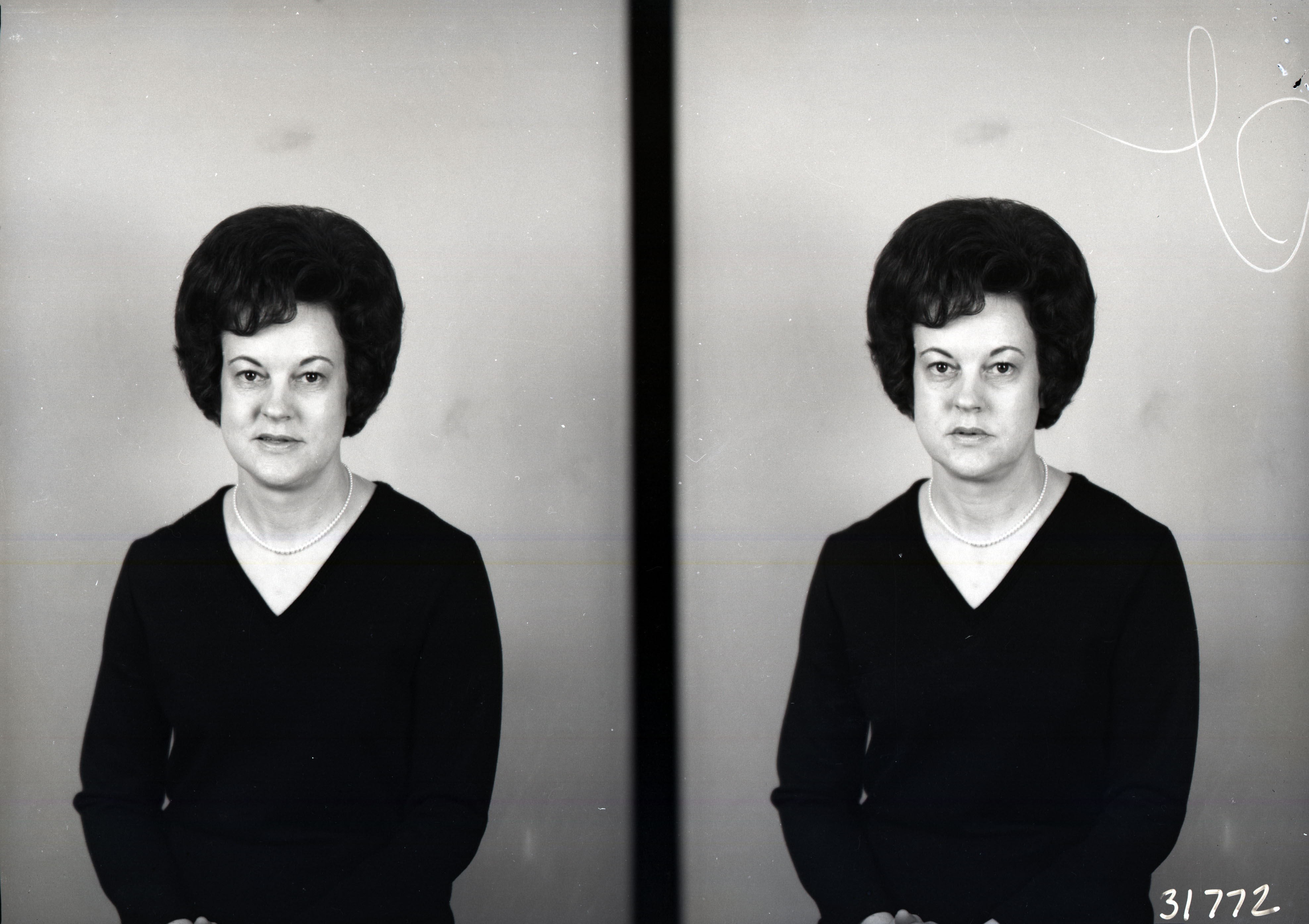 Photo of two separate portrait photographs of the same unidentified woman with short styled hair and wearing faux pearls with her dress.