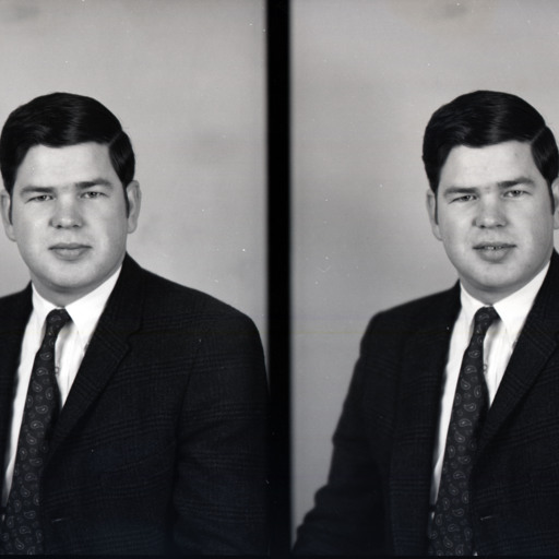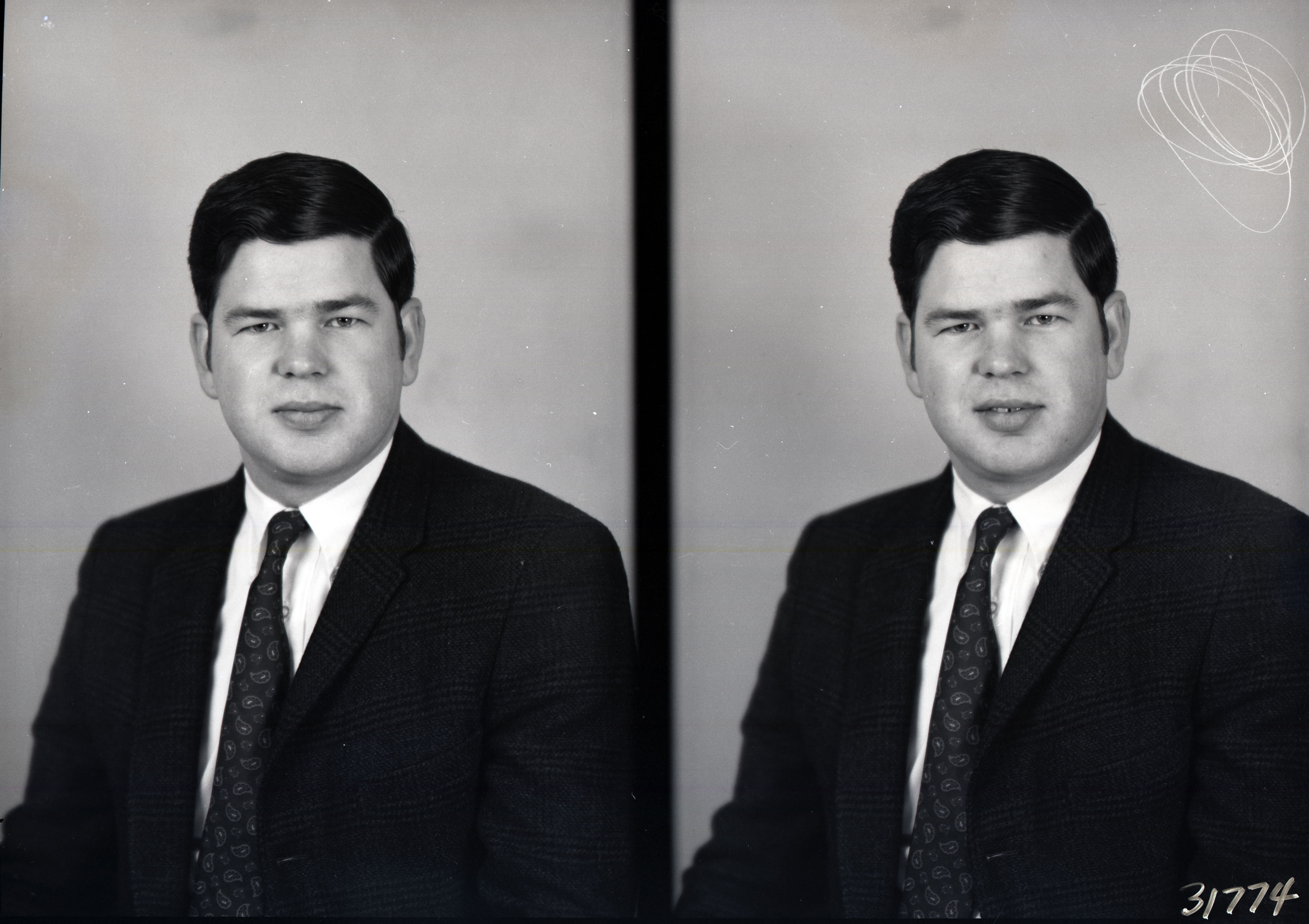 Photo of two separate portrait photographs of the same unidentified young man wearing a suit and a paisley-patterned tie.