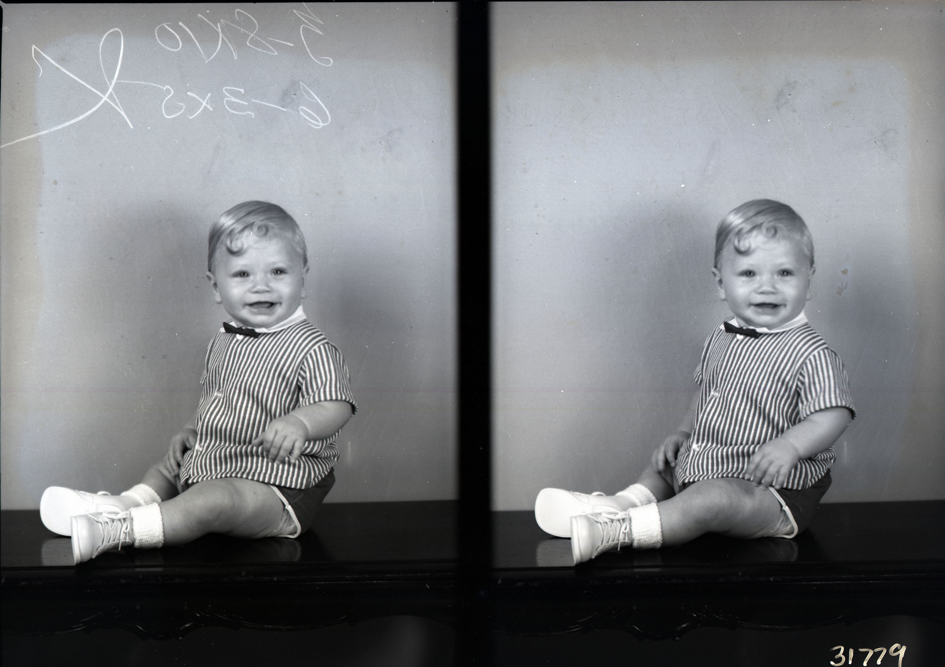 Photo of two separate photographs of the same unidentified young boy, smiling, and wearing a striped top and bow tie. His is posed seated on a bench.