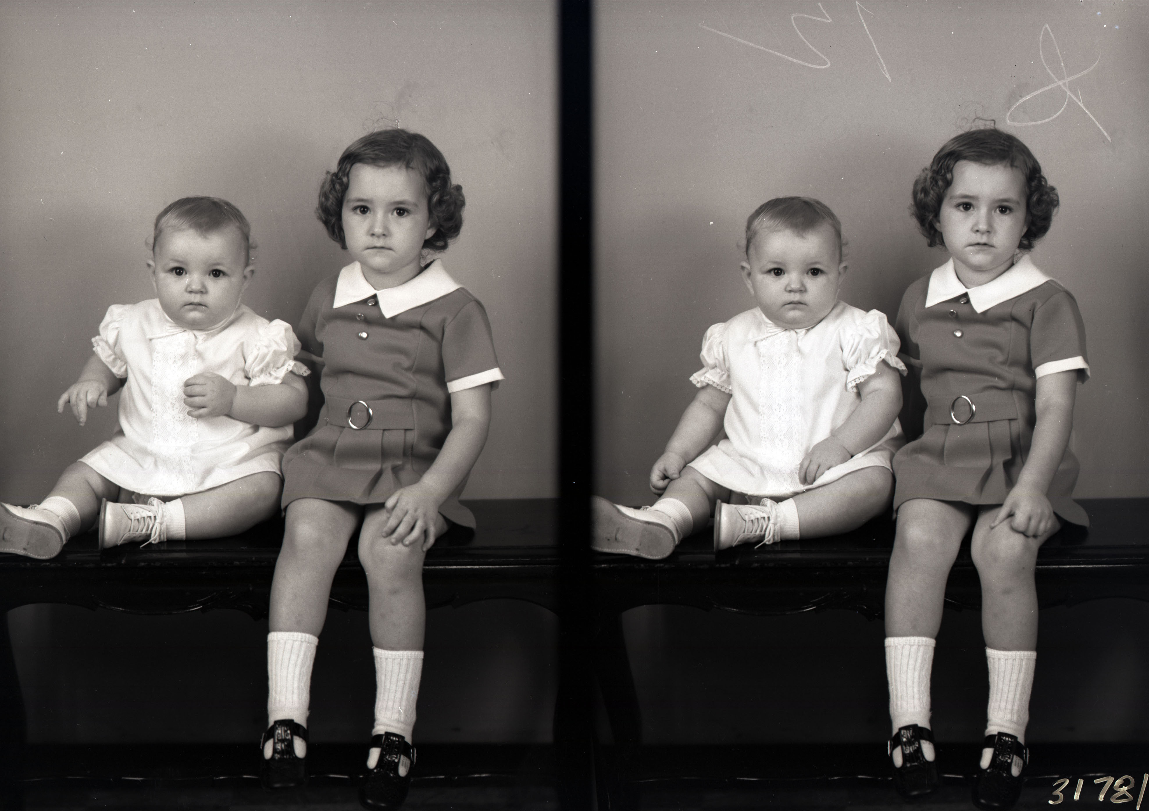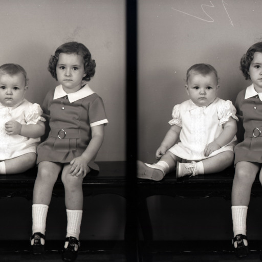 Photo of two separate photographs of the same two unidentified children, a baby and an older girl, posed together.