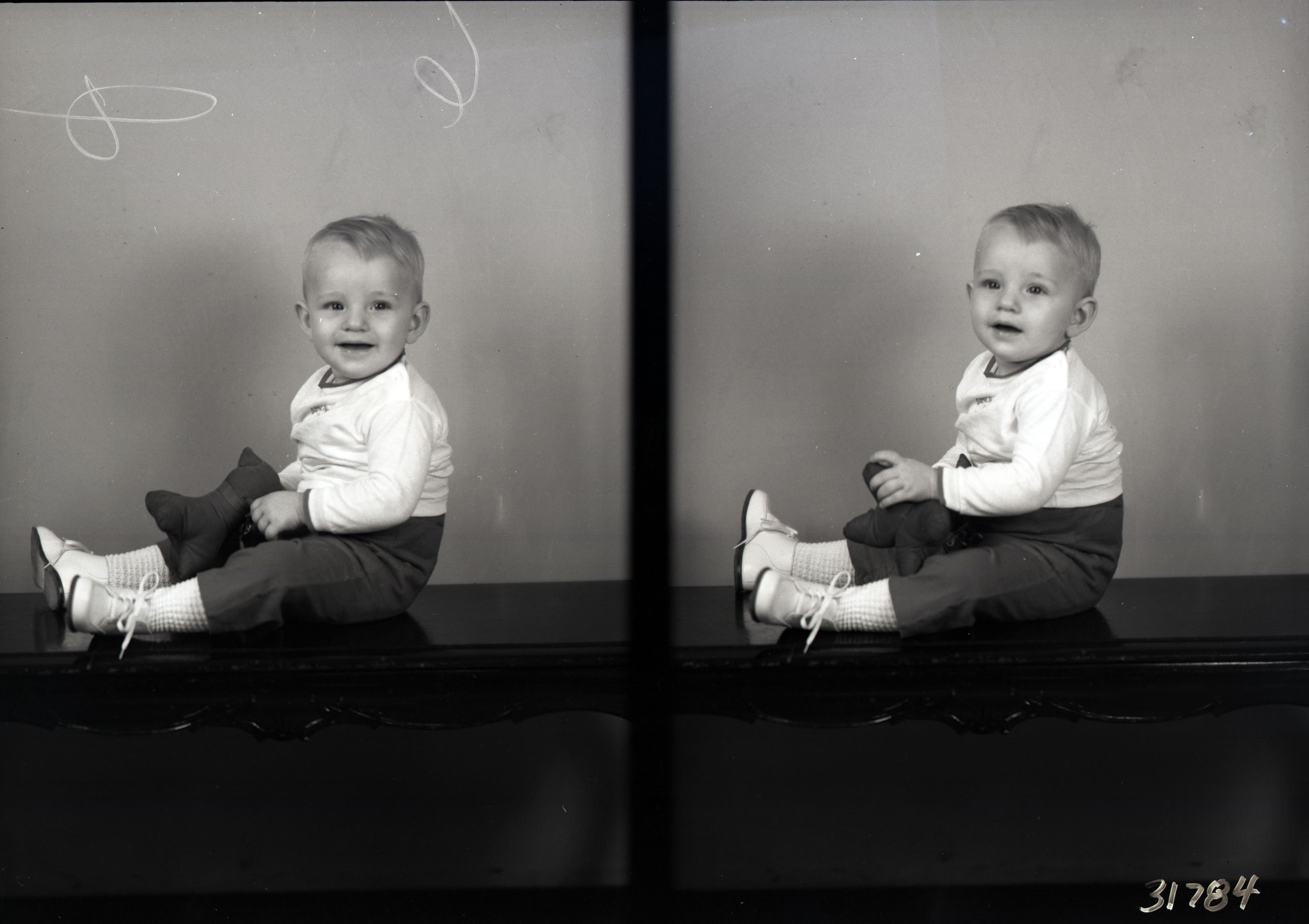Photo of two separate photographs of the same unidentified young boy seated on a bench and holding a toy in his lap.