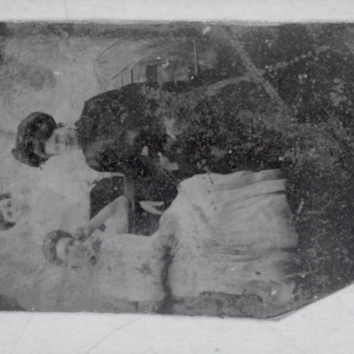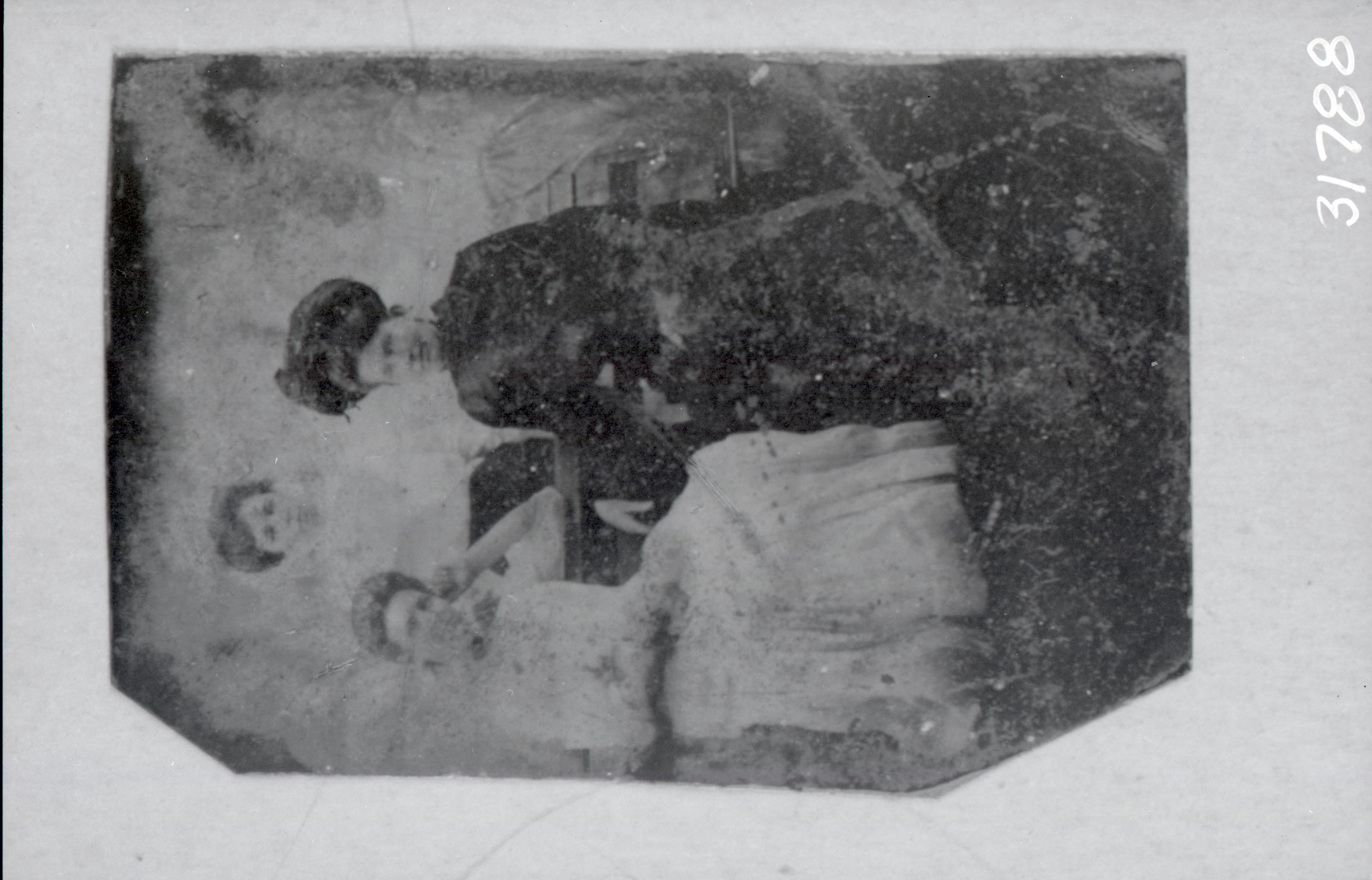 Photo of an older photograph of three unidentified women posed together and wearing clothes from an earlier era.