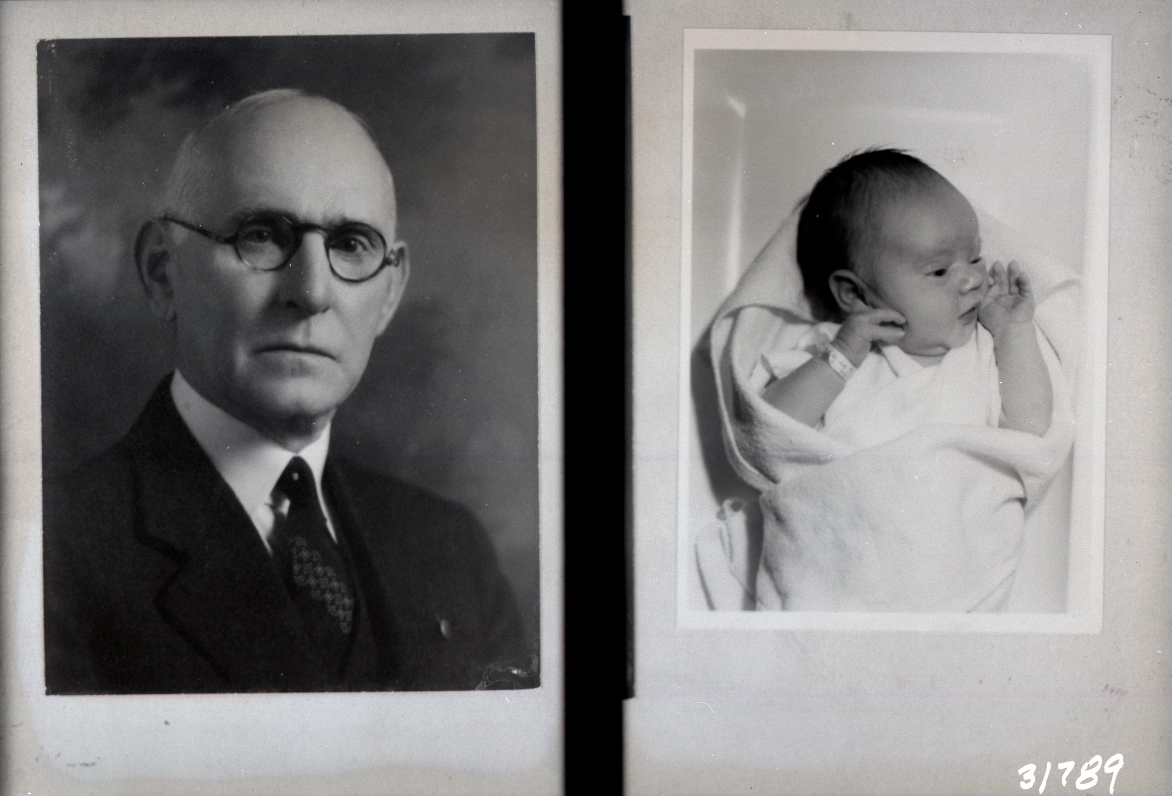 On the right is a newborn baby wrapped in a blanket and still wearing a hospital-issued wrist tag.