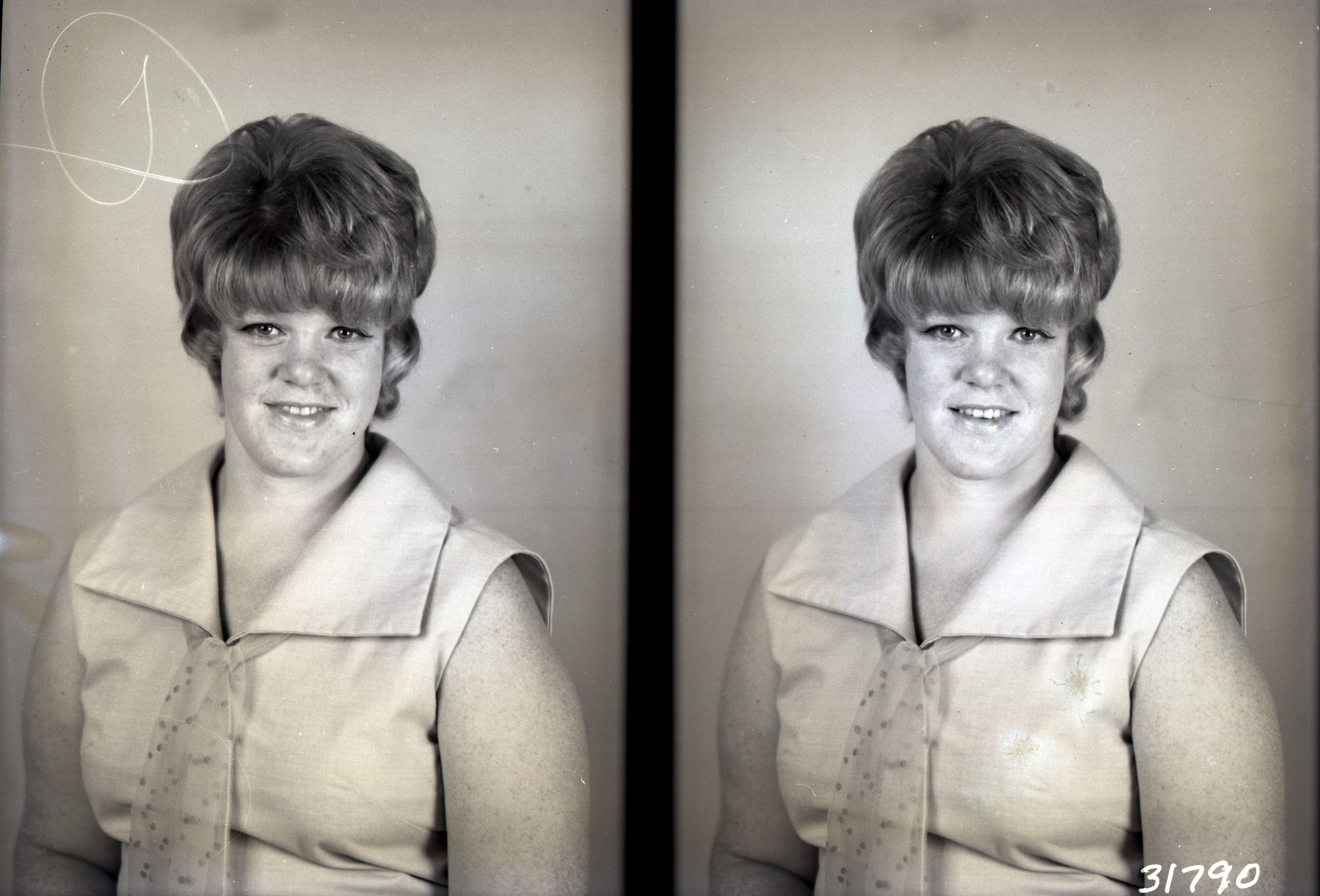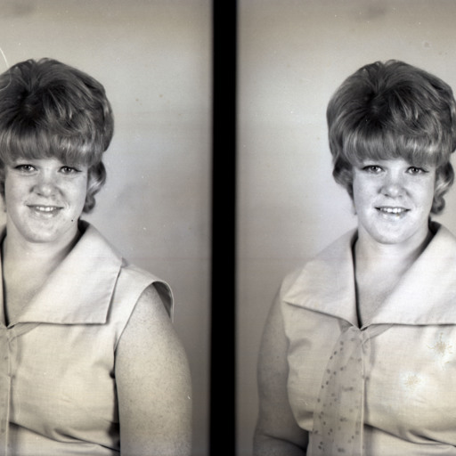 Photo of two separate portrait photographs of the same unidentified young woman with short hair and bangs and wearing a wide-collared sleeveless dress with a scarf.