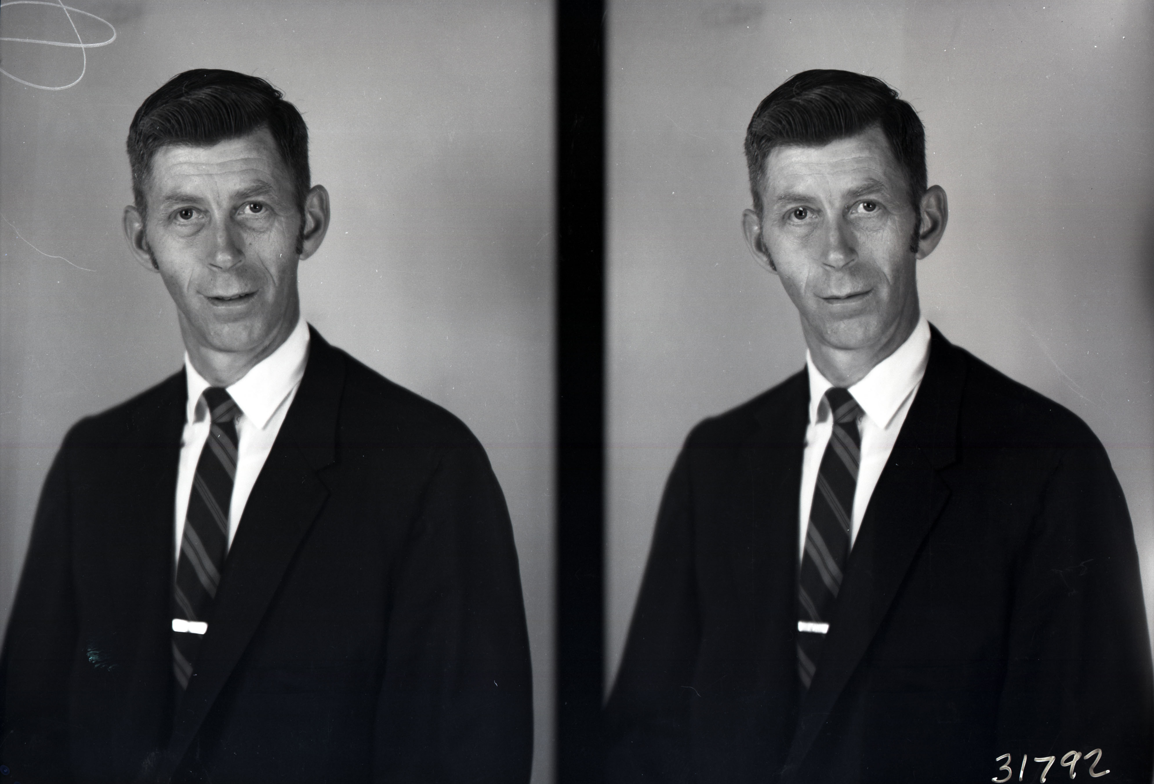 Photo of two separate portrait photographs of the same unidentified man with sideburns and wearing a suit and striped tie.