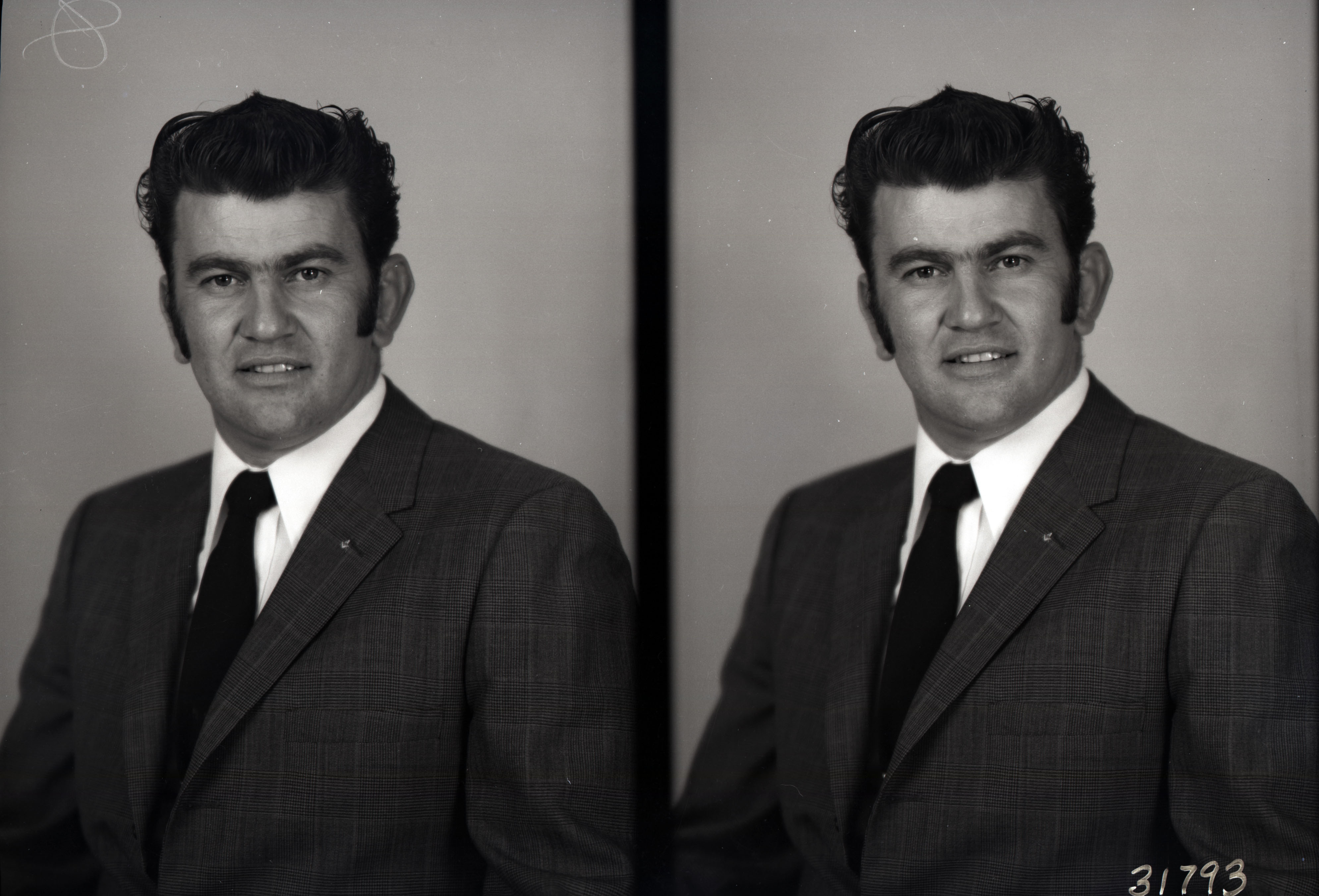 Photo of two separate portrait photographs of the same unidentified man with sideburns and wearing a suit and tie.