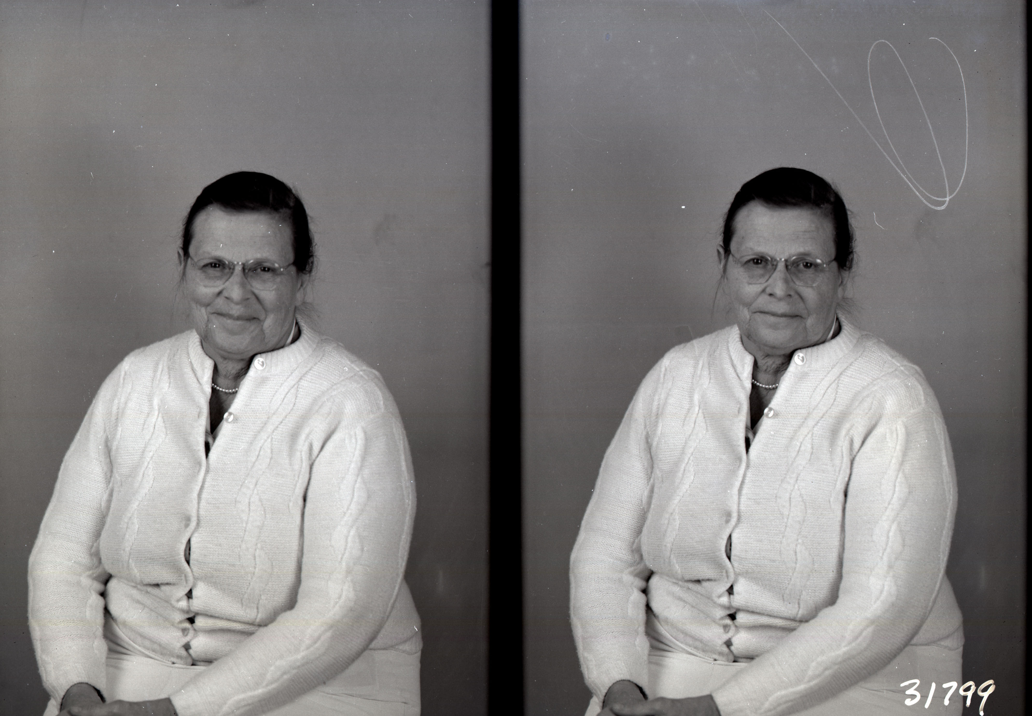 Photo of two separate photographs of the same unidentified older woman wearing a buttoned cardigan sweater.