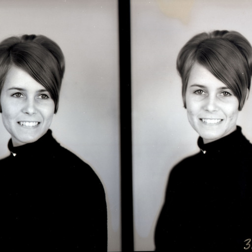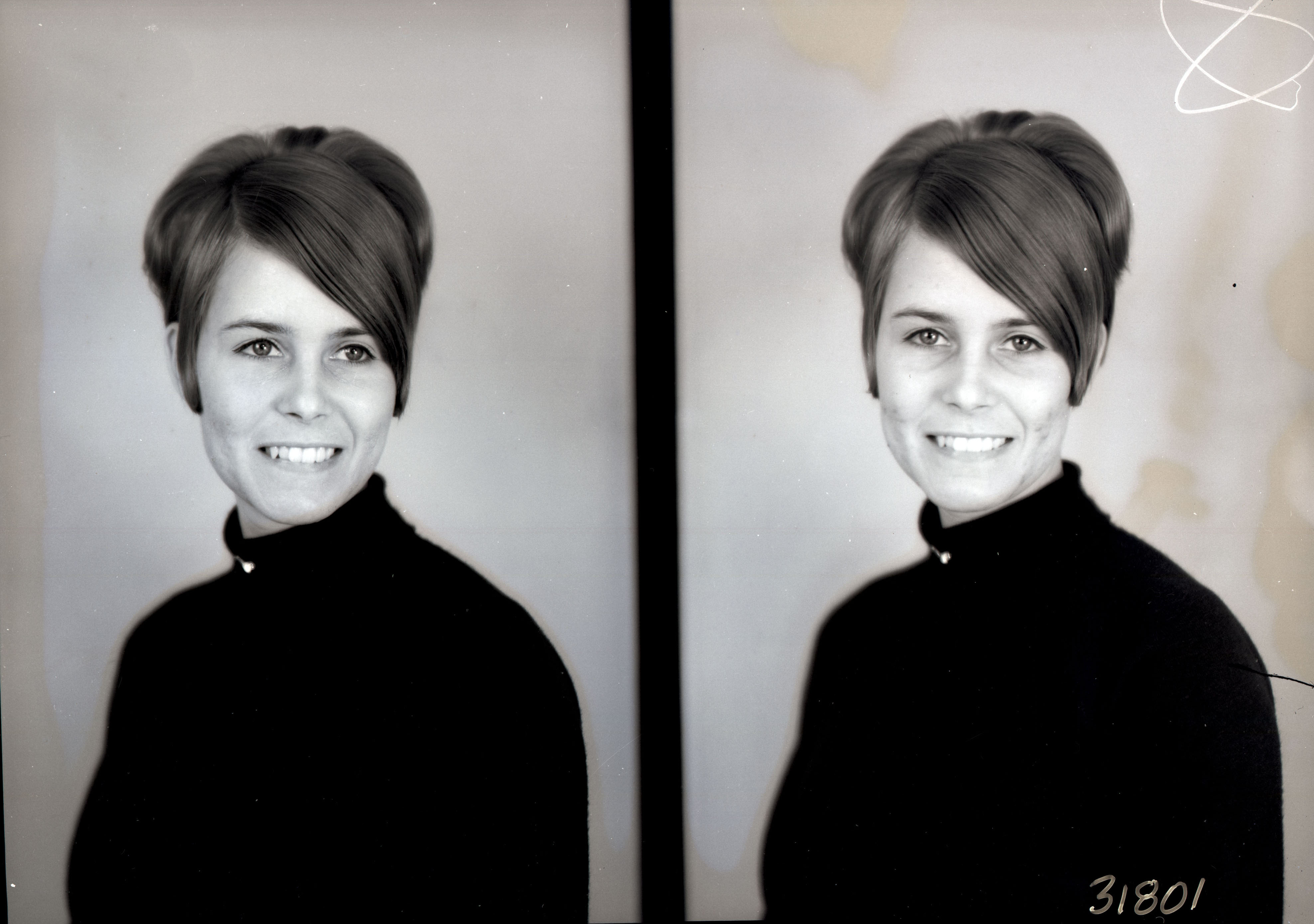 Photo of two separate portrait photographs of the same unidentified woman with short styled hair parted on the side.