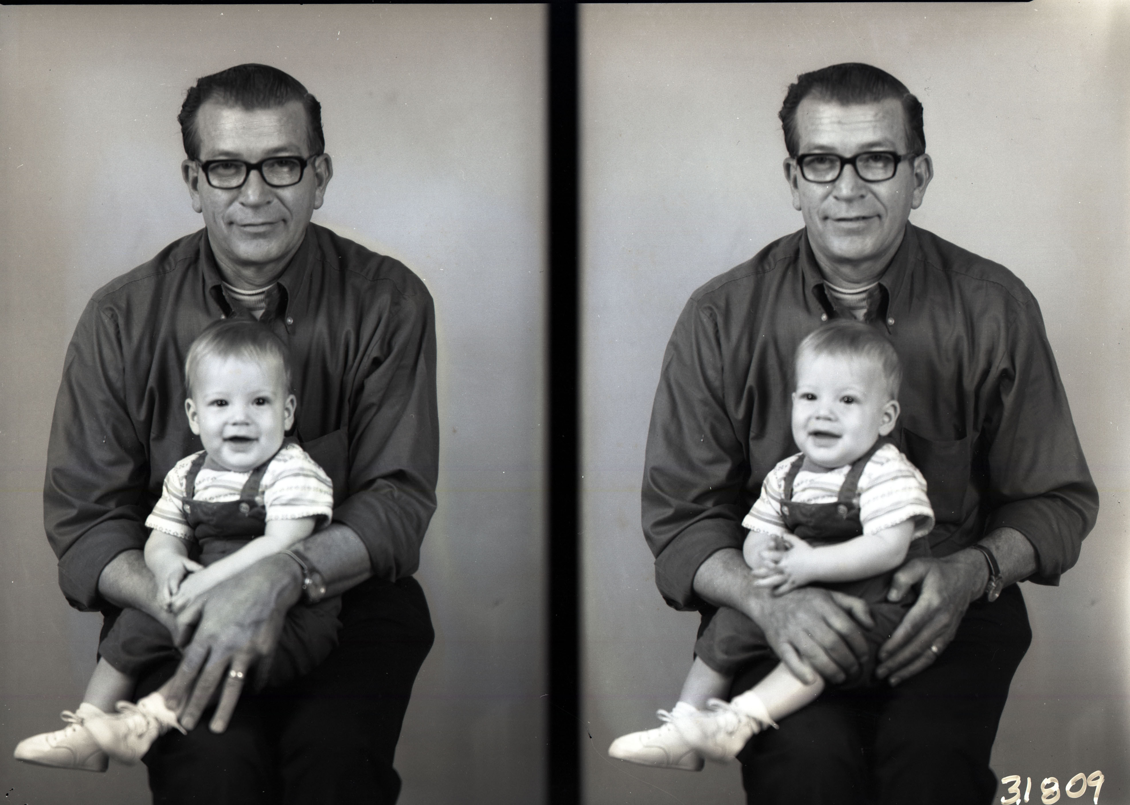 Photo of two separate photographs of an unidentified man with glasses seated with an unidentified young boy on his lap.