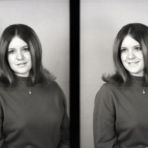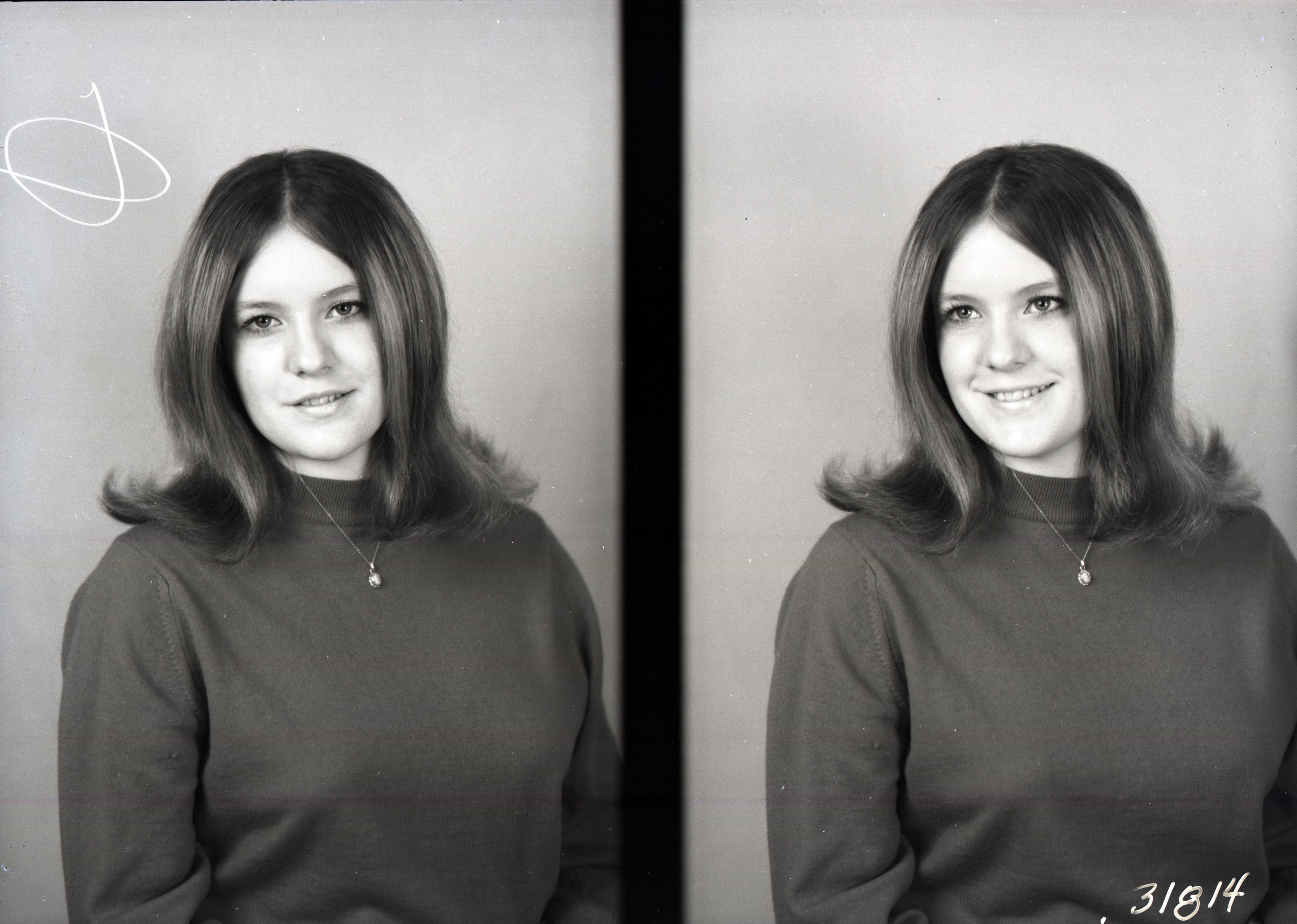 Photo of two separate portrait photographs of the same unidentified young woman with straight hair parted in the middle.