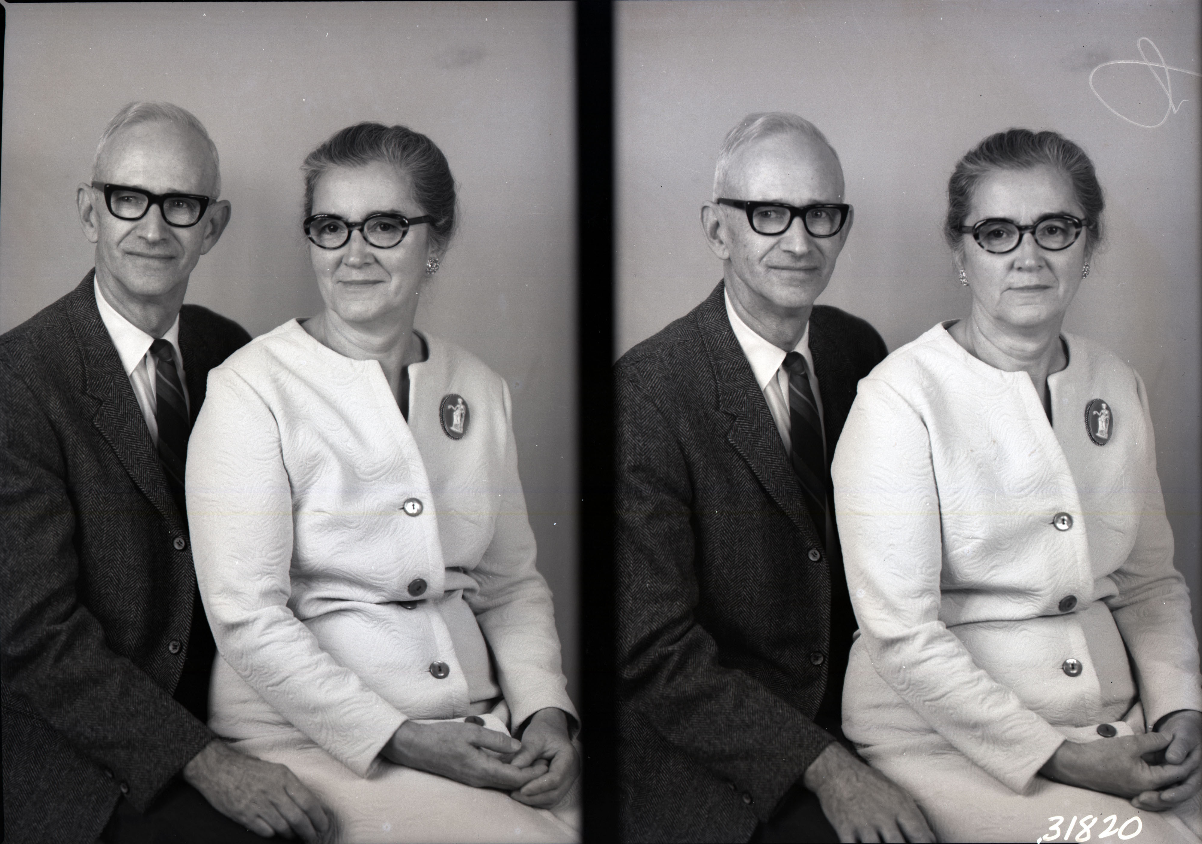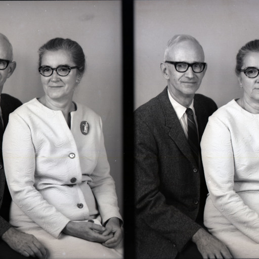 Photo of two separate photographs of the same unidentified man and woman, both wearing glasses, posed together.