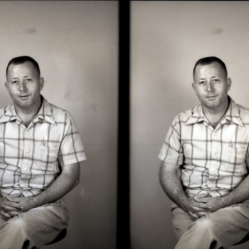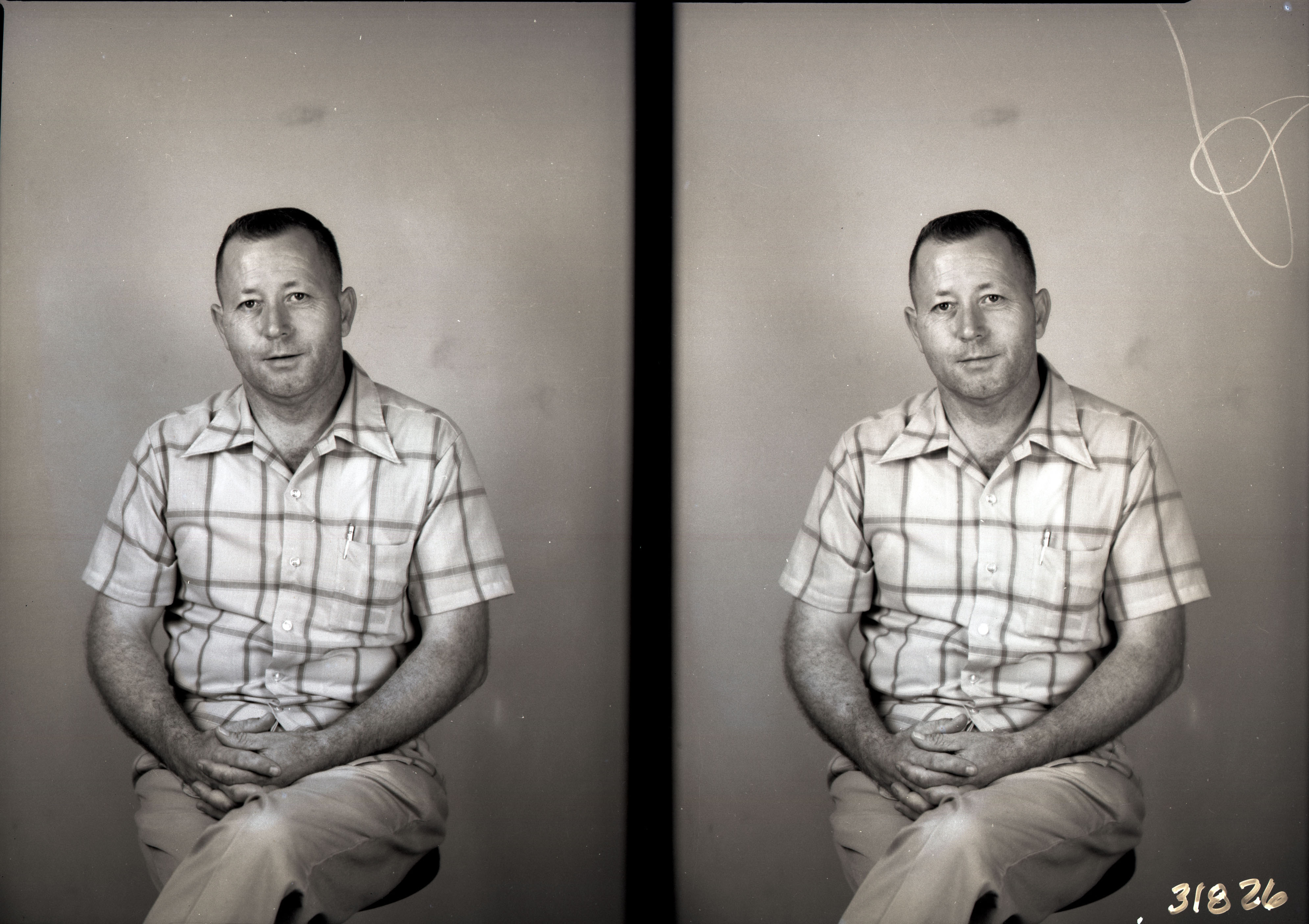 Photo of two separate photographs of the same unidentified man wearing a short-sleeved print shirt and seated on a stool with his legs crossed and his hands in his lap.