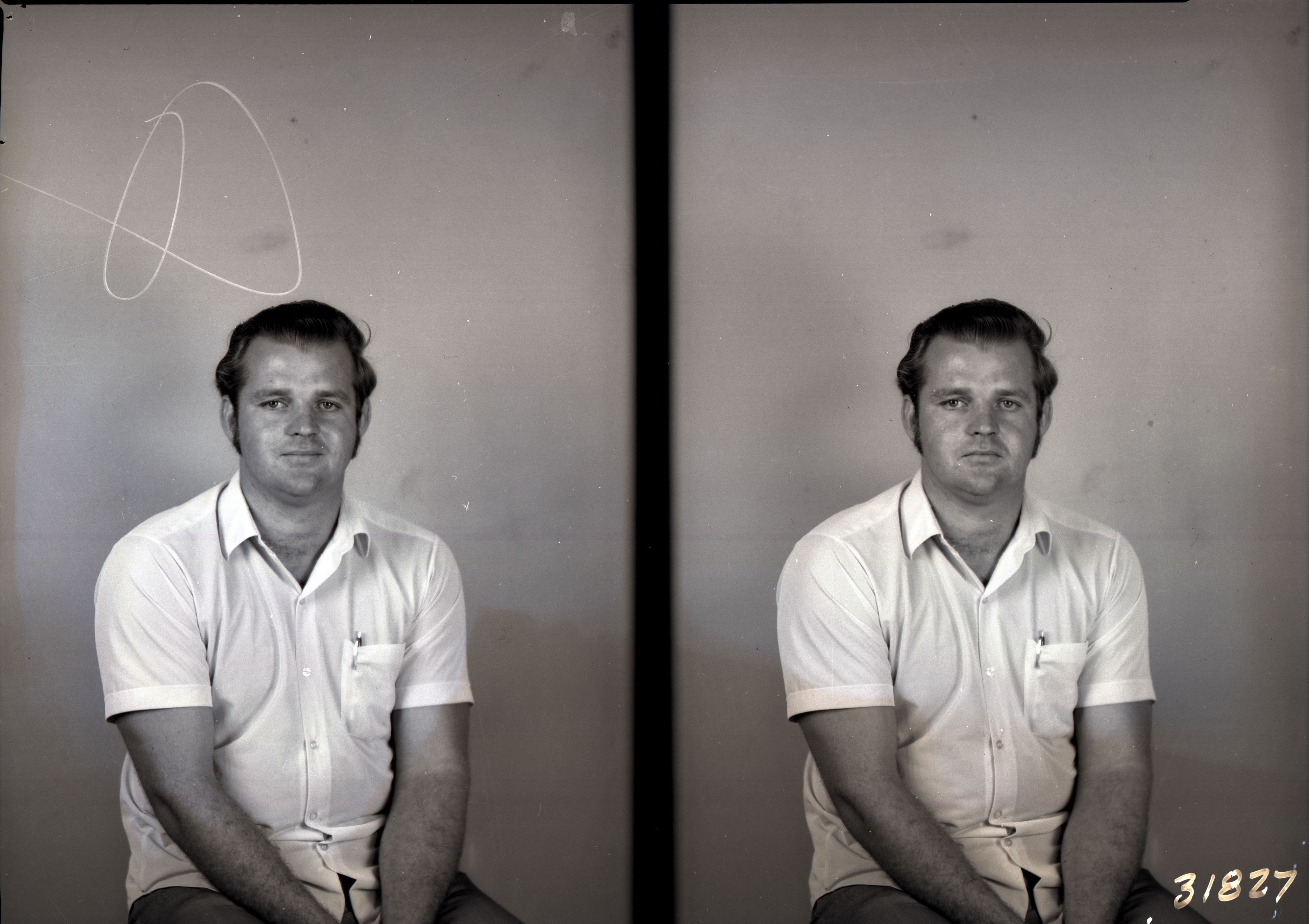 Photo of two separate photographs of the same unidentified man with sideburns and wearing a short-sleeved, buttoned shirt.