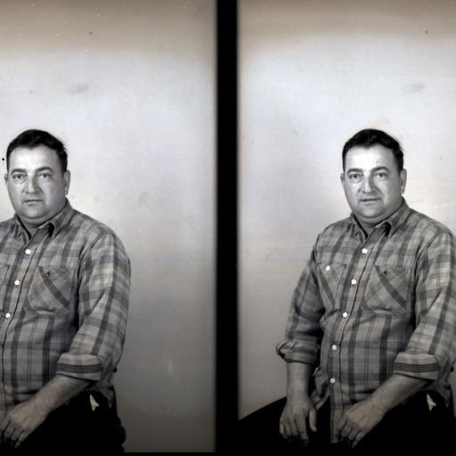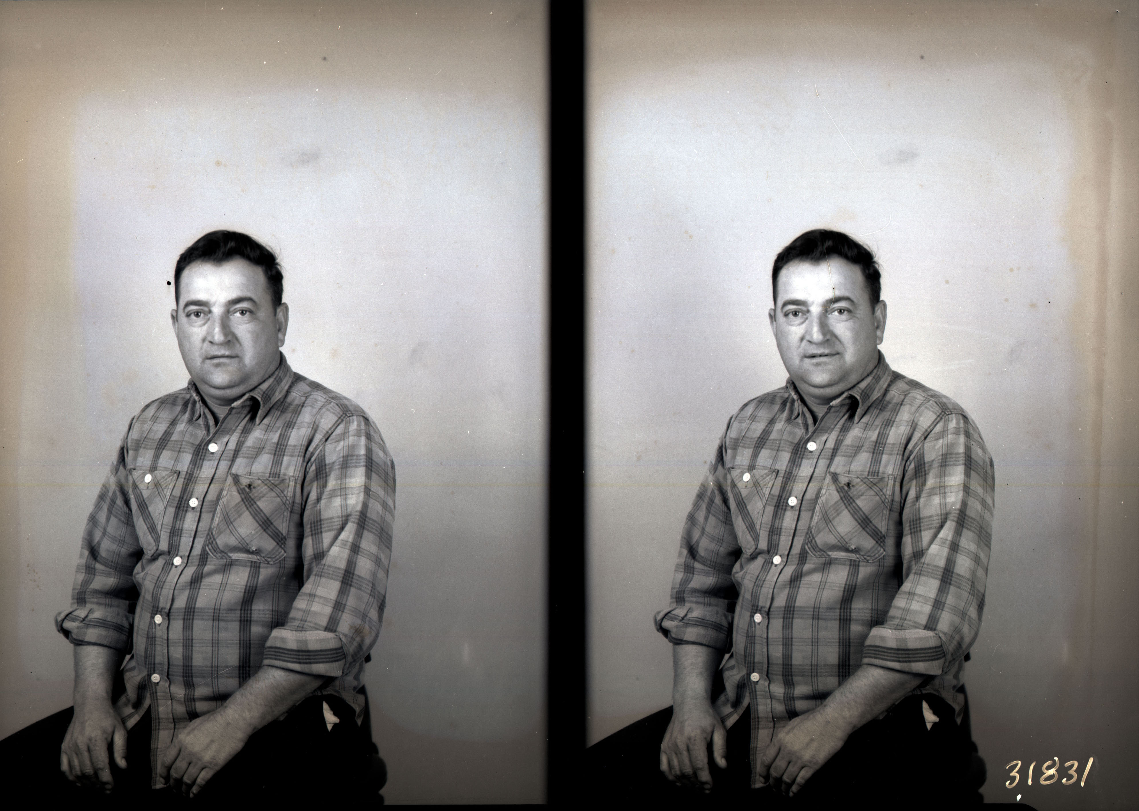 Photo of two separate photographs of the same unidentified man wearing a plaid work shirt with the sleeves rolled up his arms.