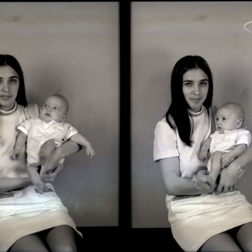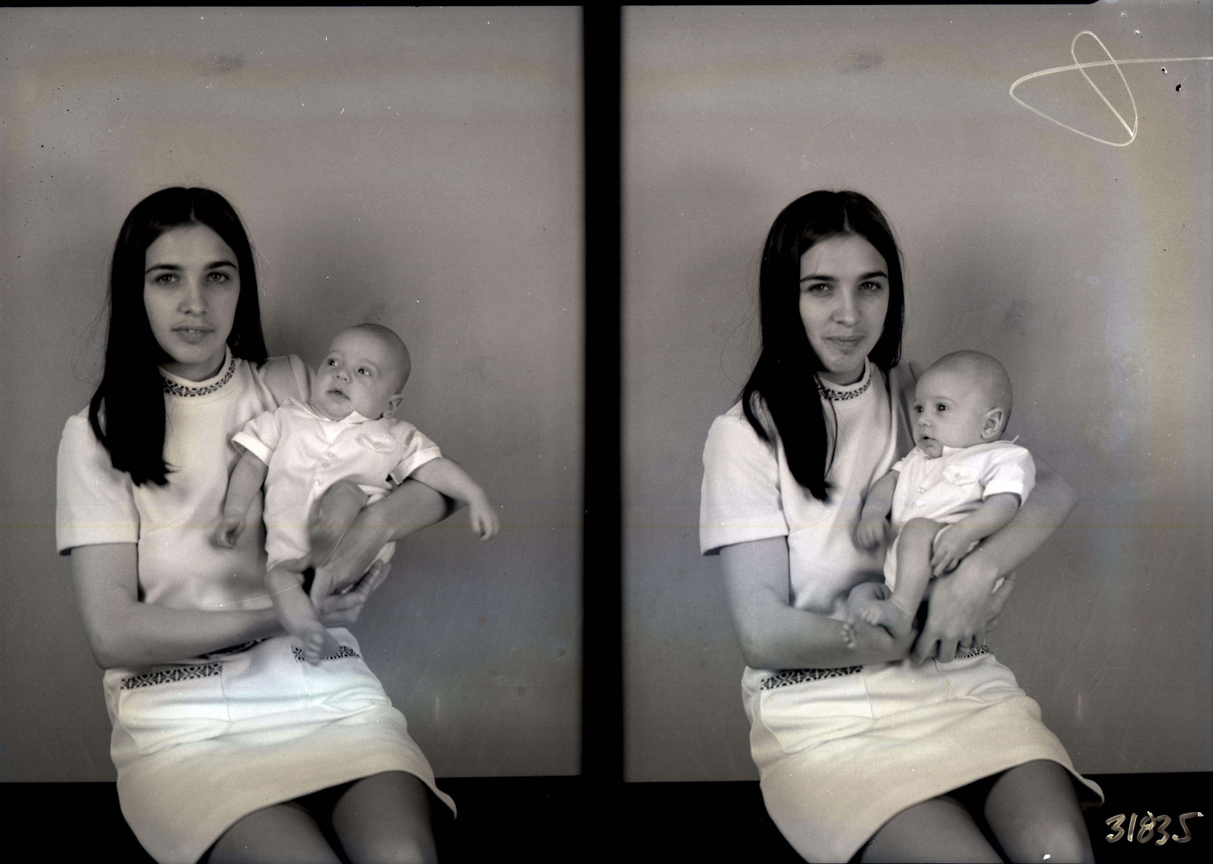 Photo of two separate photographs of the same unidentified young woman, probably teen-aged, with long straight hair and holding an unidentified barefoot baby.