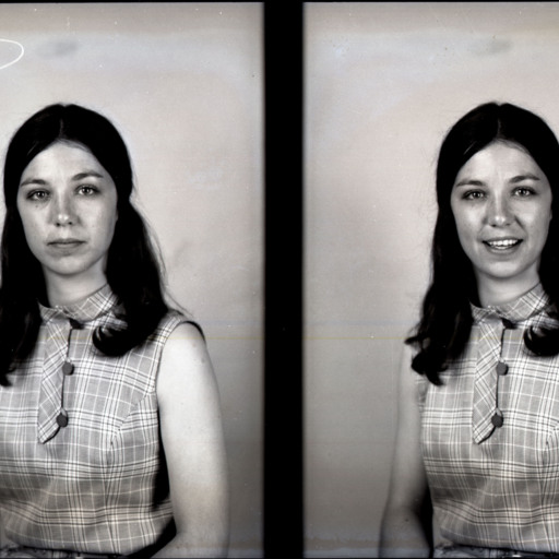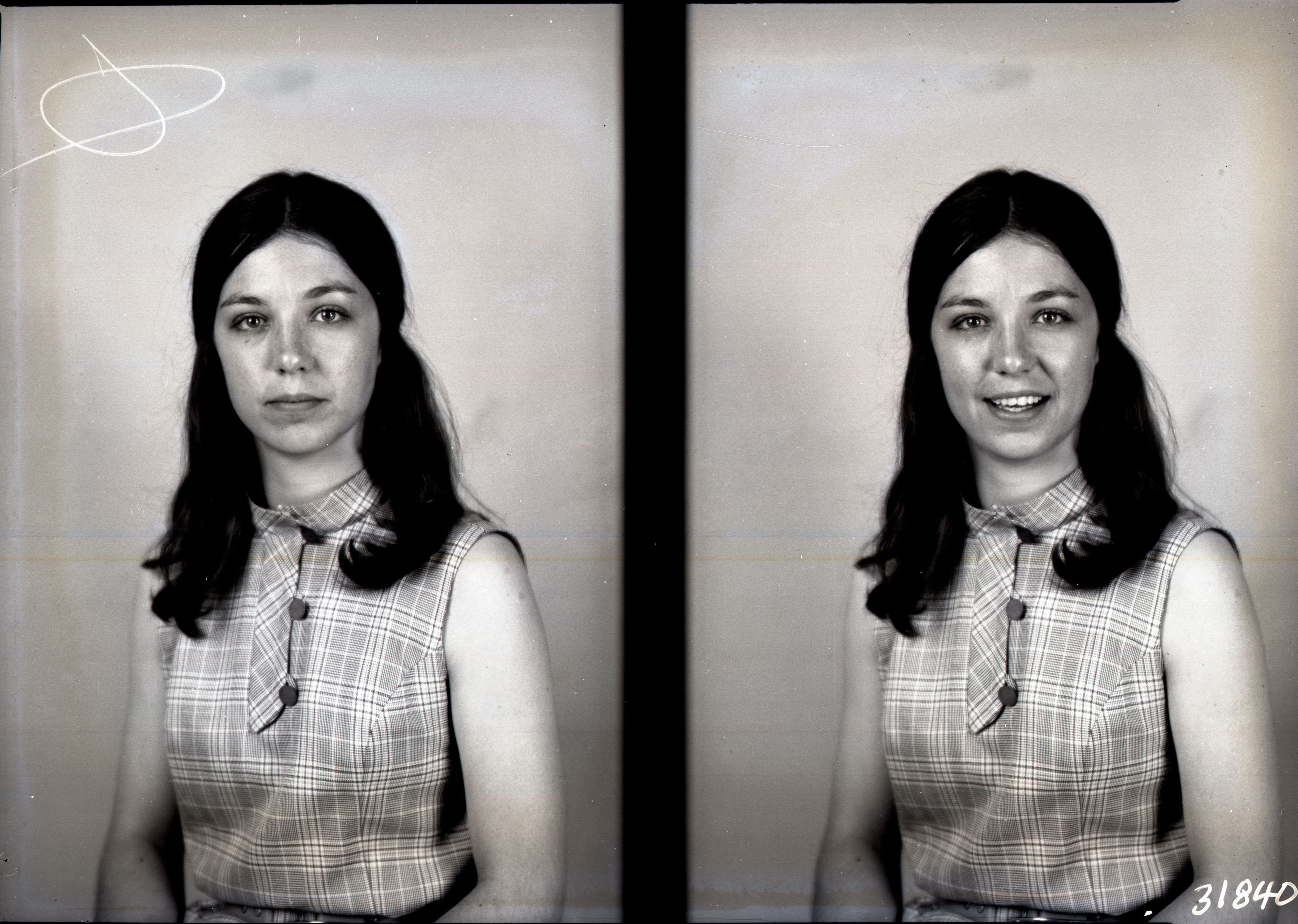 Photo of two separate portrait photographs of the same unidentified young woman with long straight hair parted in the middle and wearing a sleeveless, plaid top.