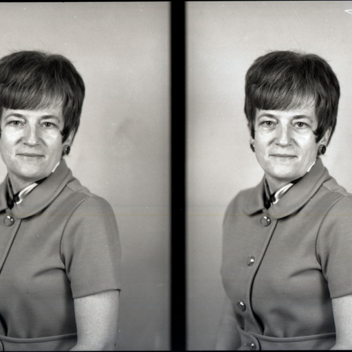 Photo of two separate portrait photographs of the same unidentified woman with short styled hair and bangs. She is wearing earrings and a scarf with her short-sleeved dress.