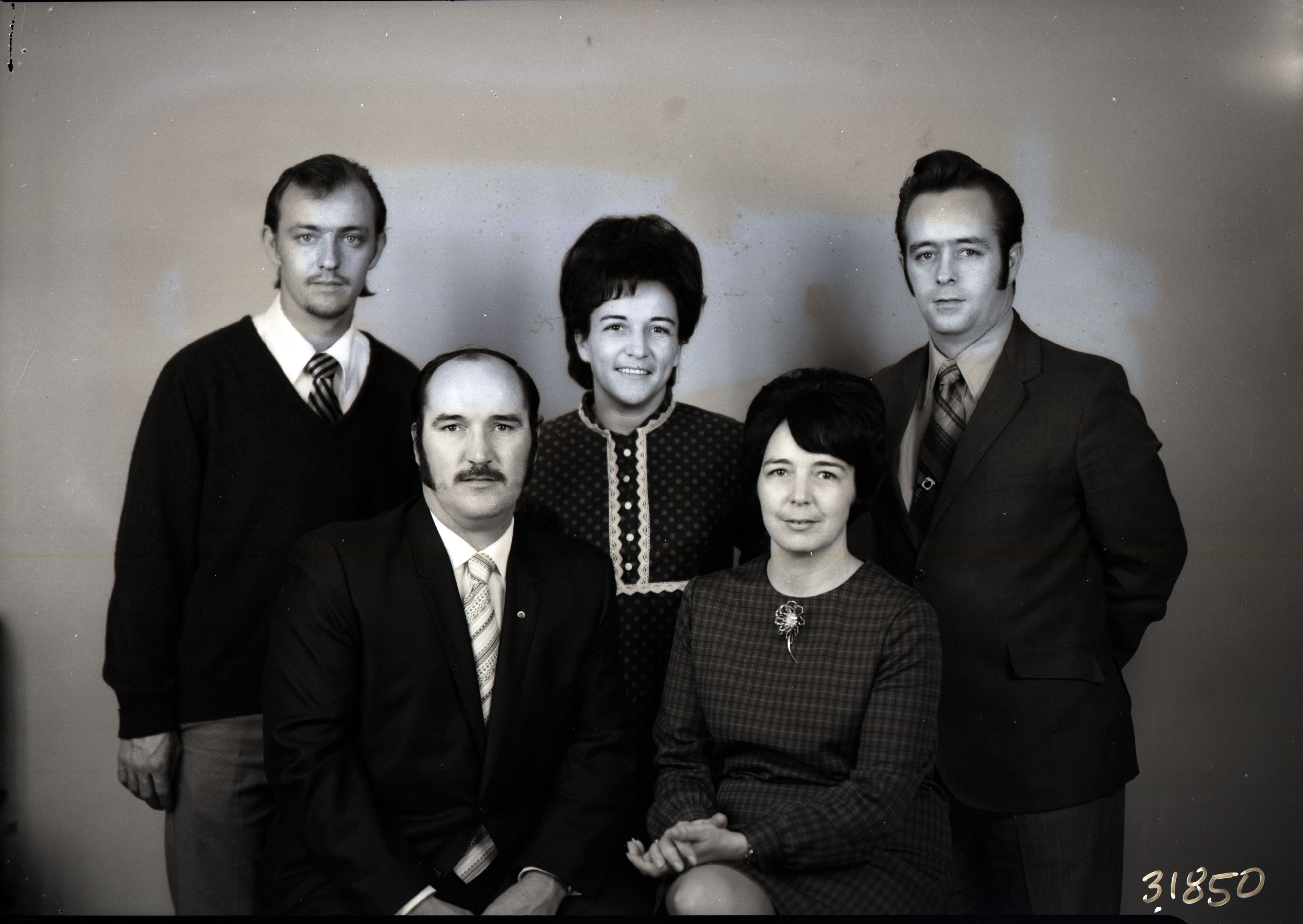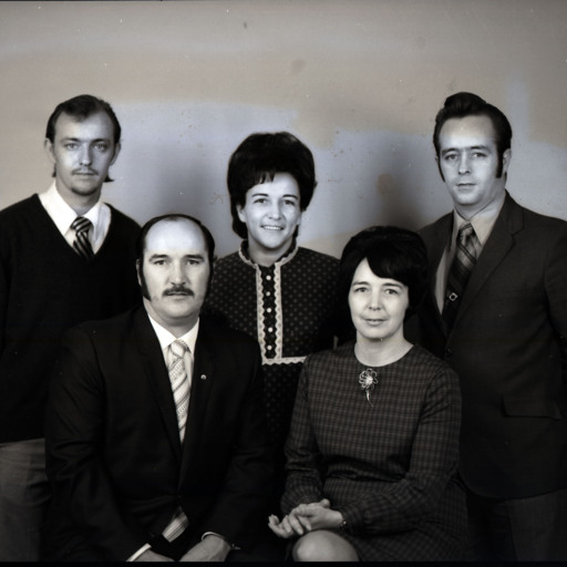 Unidentified man with sideburns and a mustache is seated in front beside an unidentified woman wearing a plaid dress. Three unidentified young adults are standing behind them.