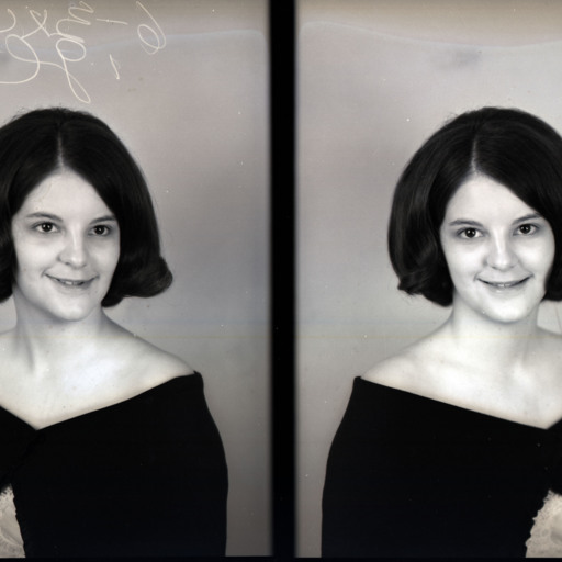Photo of two separate portrait photographs of the same unidentified young woman with short styled hair and wearing a photographer's drape.