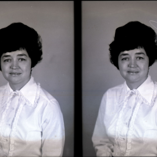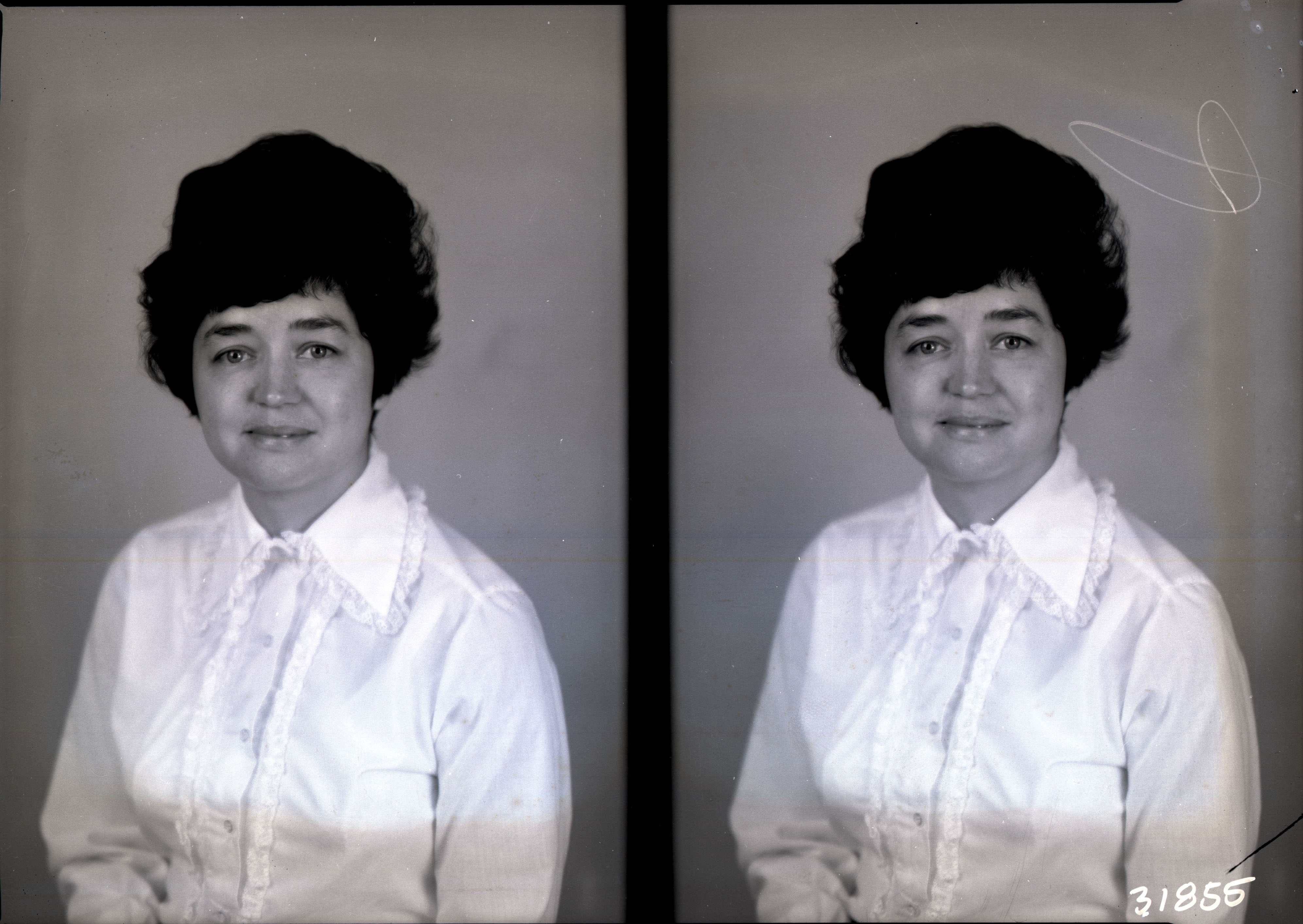 Photo of two separate portrait photographs of the same unidentified woman with short hair and wearing a buttoned blouse with lace edging on the collar.