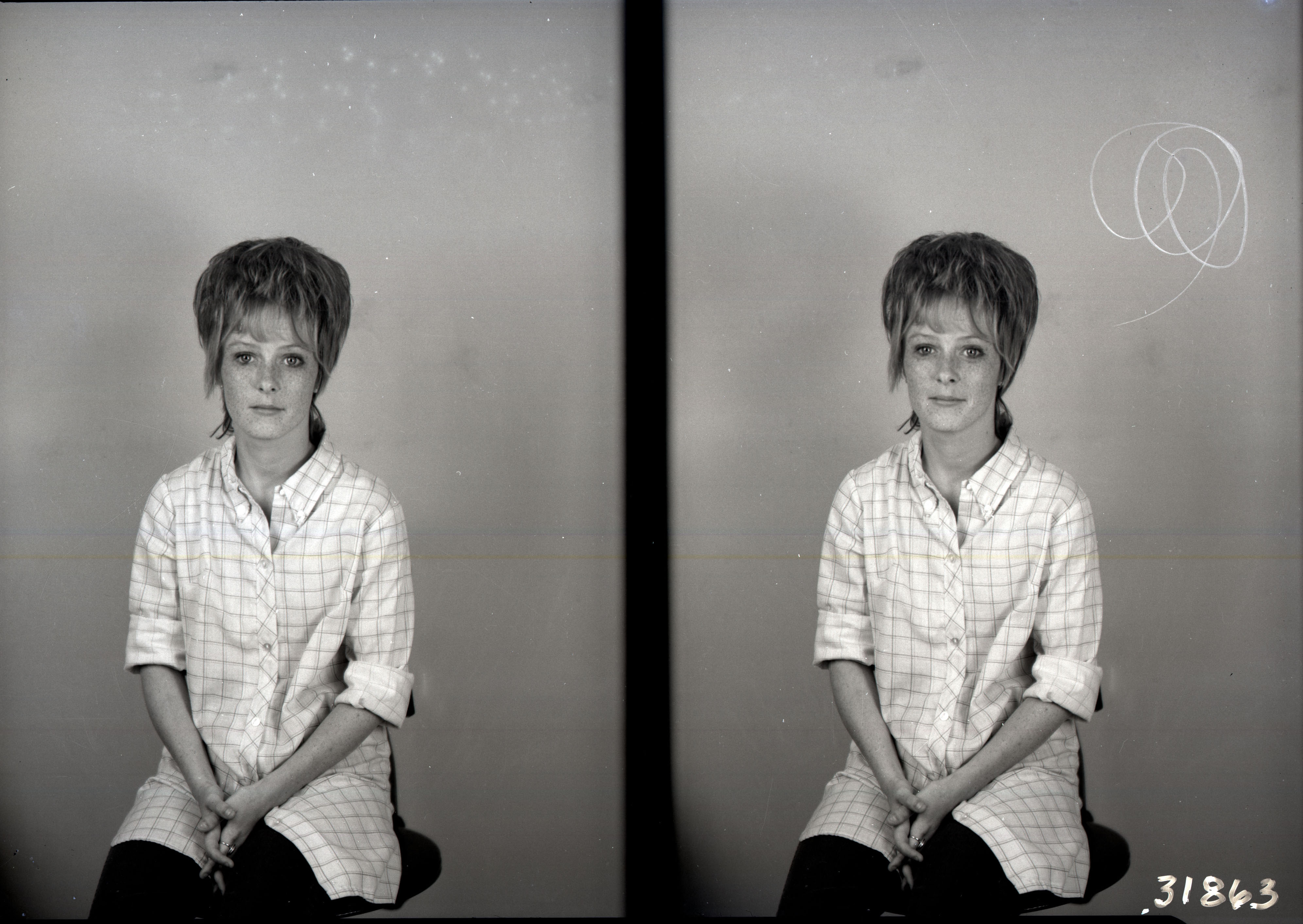 Photo of two separate photographs of the same unidentified woman with short styled hair and wearing a shirt with the sleeves rolled up.