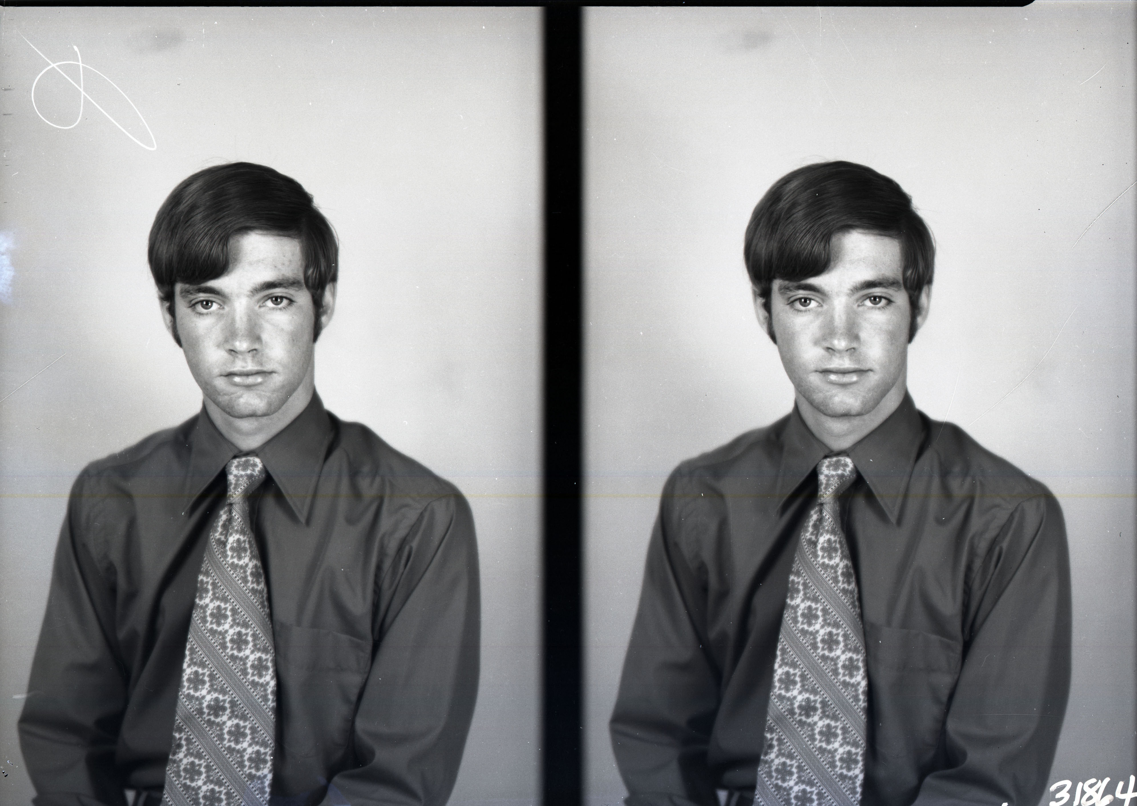 Photo of two separate portrait photographs of the same unidentified young man wearing a shirt and tie.