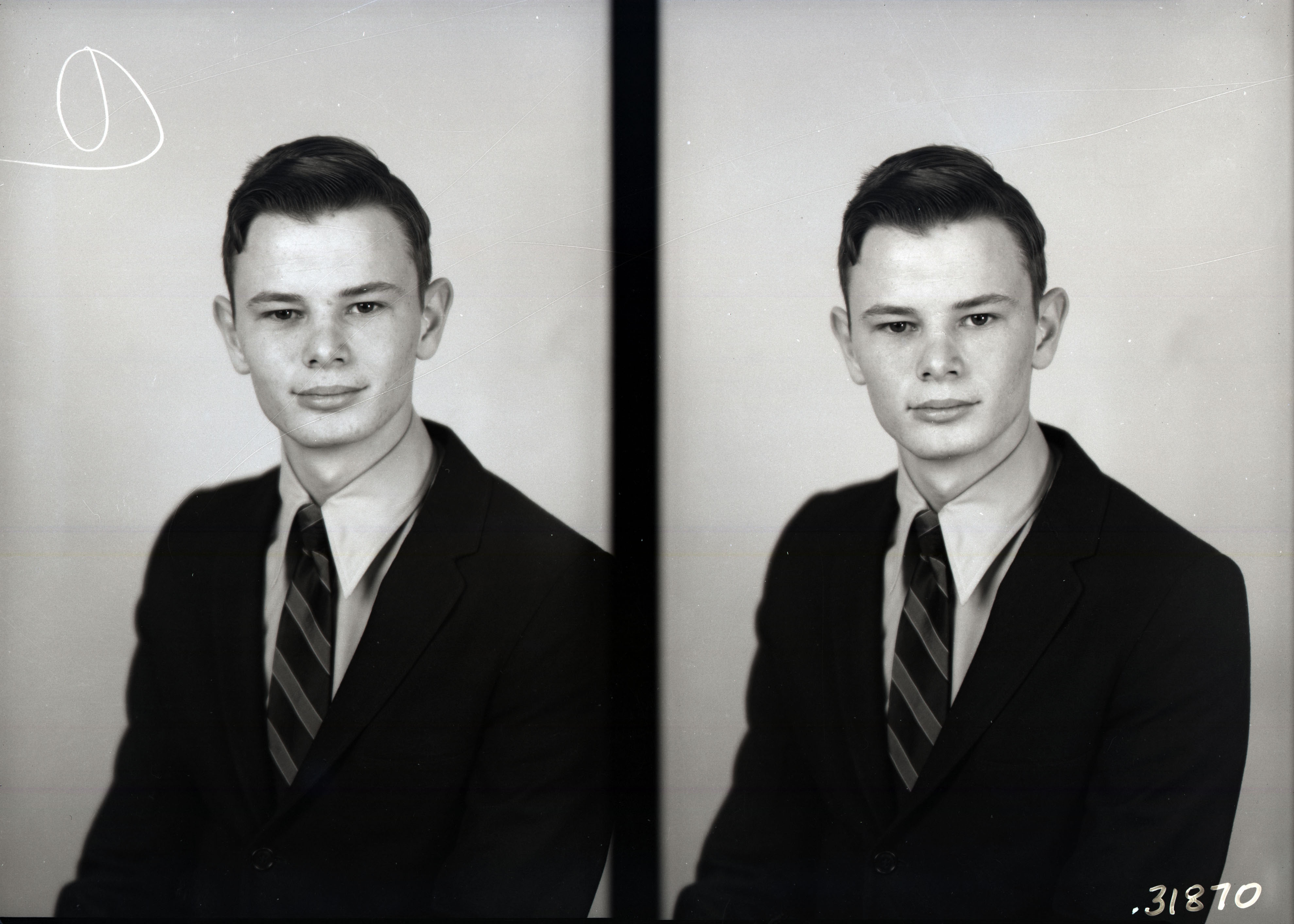 Photo of two separate portrait photographs of the same unidentified young man wearing a suit and striped tie.