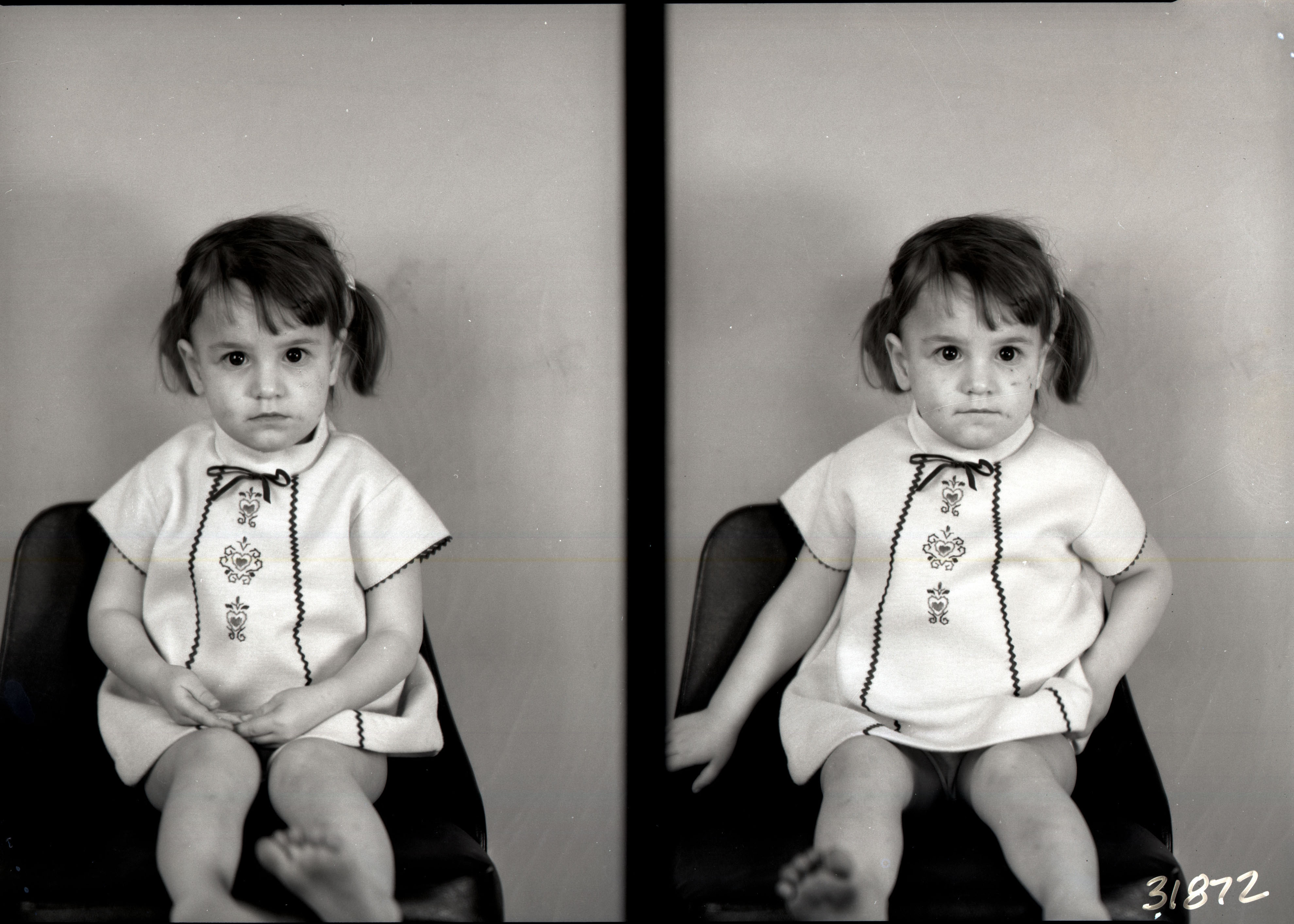 Photo of two separate photographs of the same unidentified young barefoot girl with pigtails and wearing a dress.