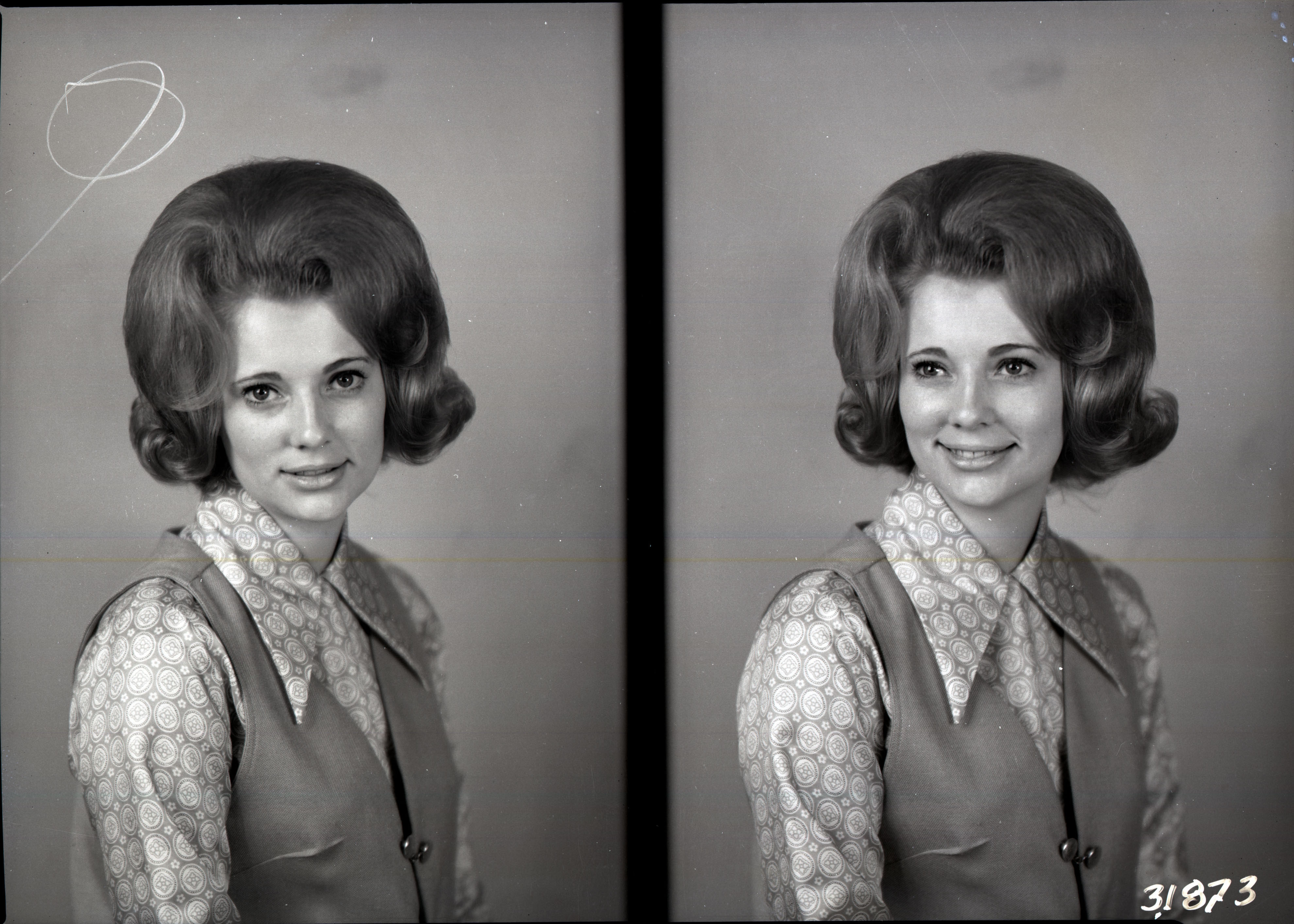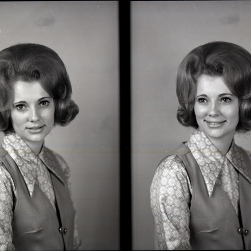 Photo of two separate portrait photographs of the same unidentified woman with coiffed hair and wearing a vest over a print blouse.