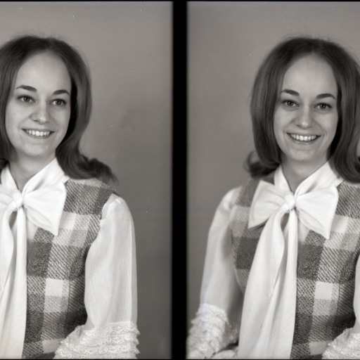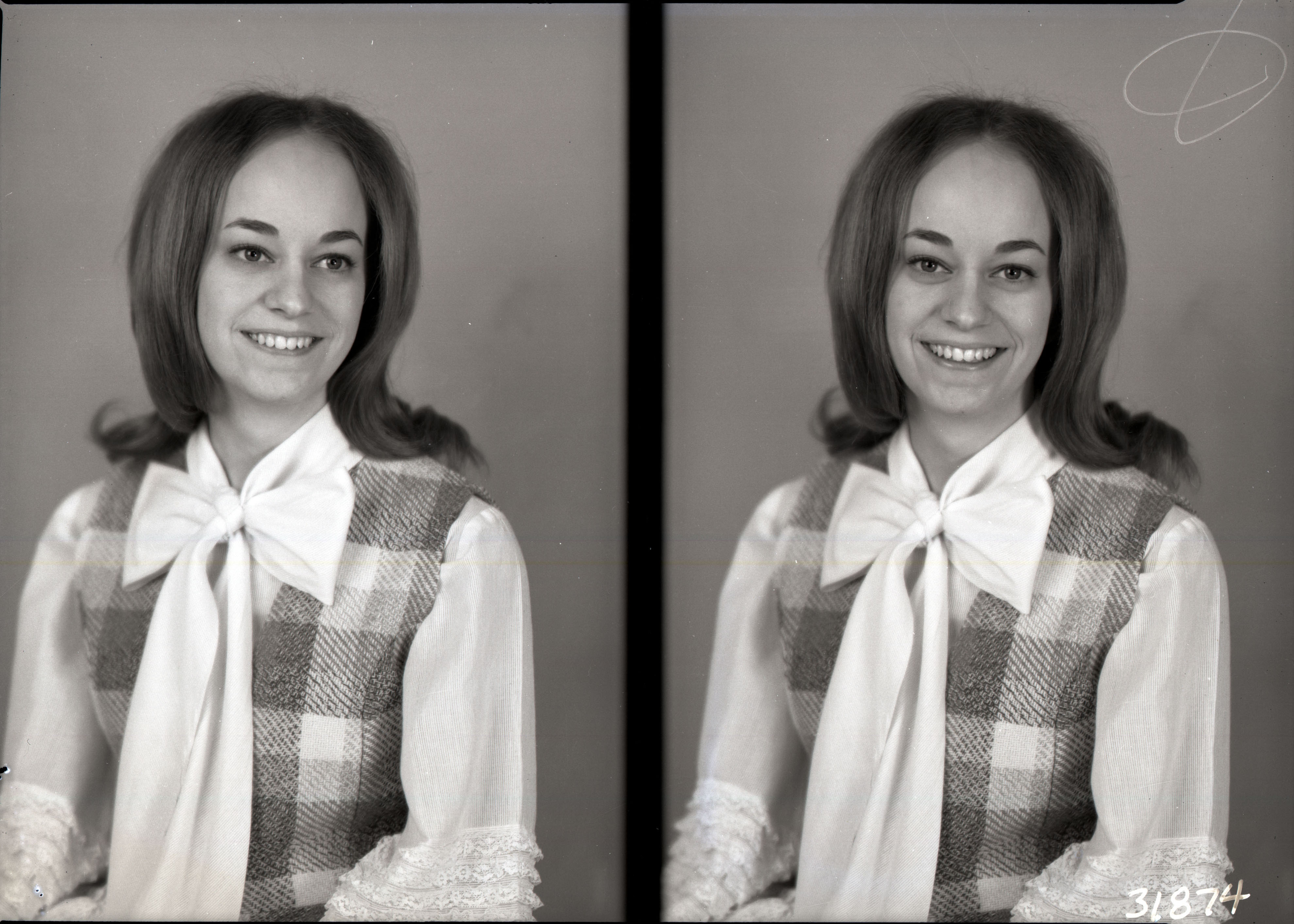 Photo of two separate portrait photographs of the same unidentified young woman with long straight hair and wearing a plaid jumper and a blouse with a tied bow on the front.