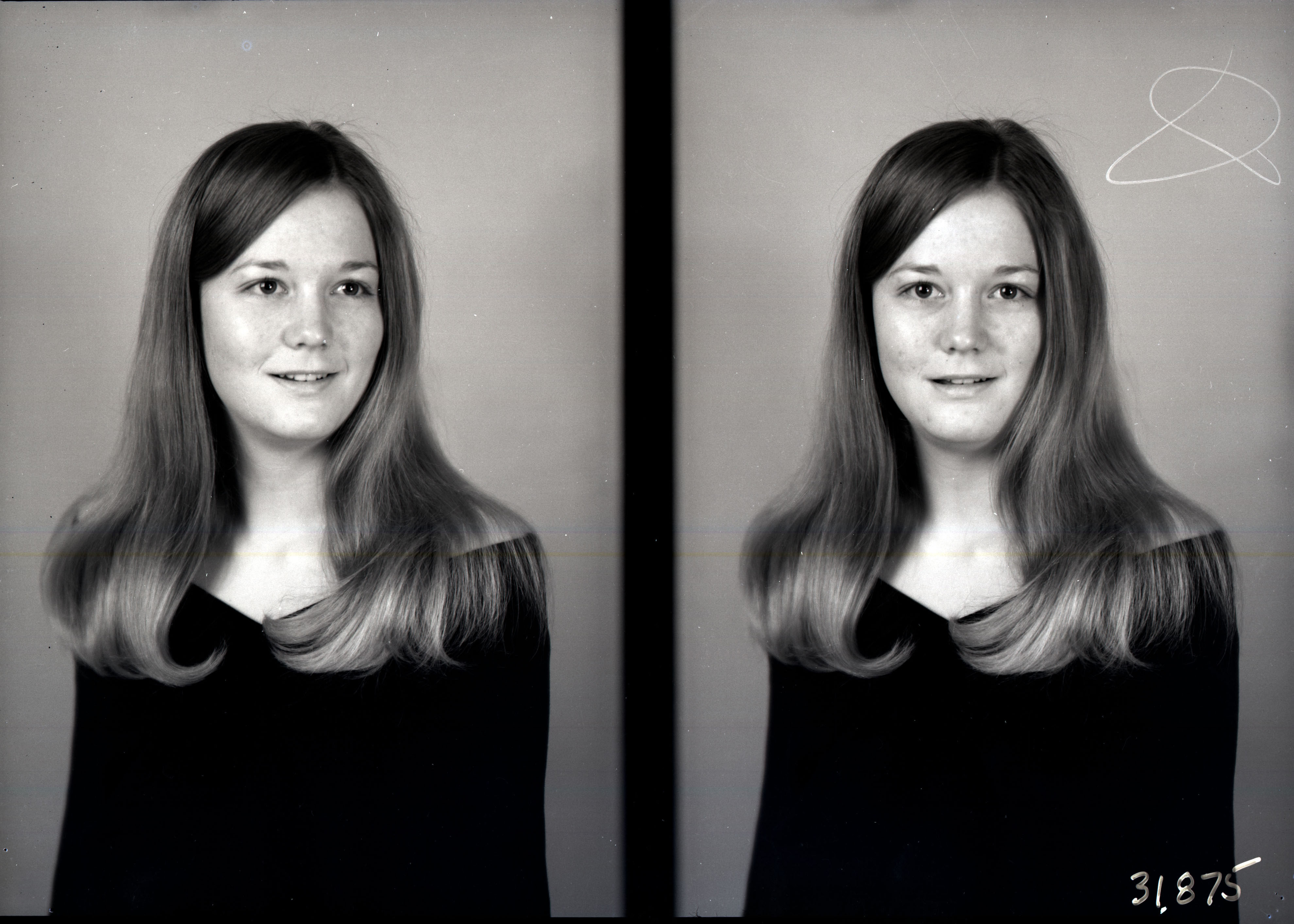 Photo of two separate portrait photographs of the same unidentified young woman with long straight hair and wearing a photographer's drape.