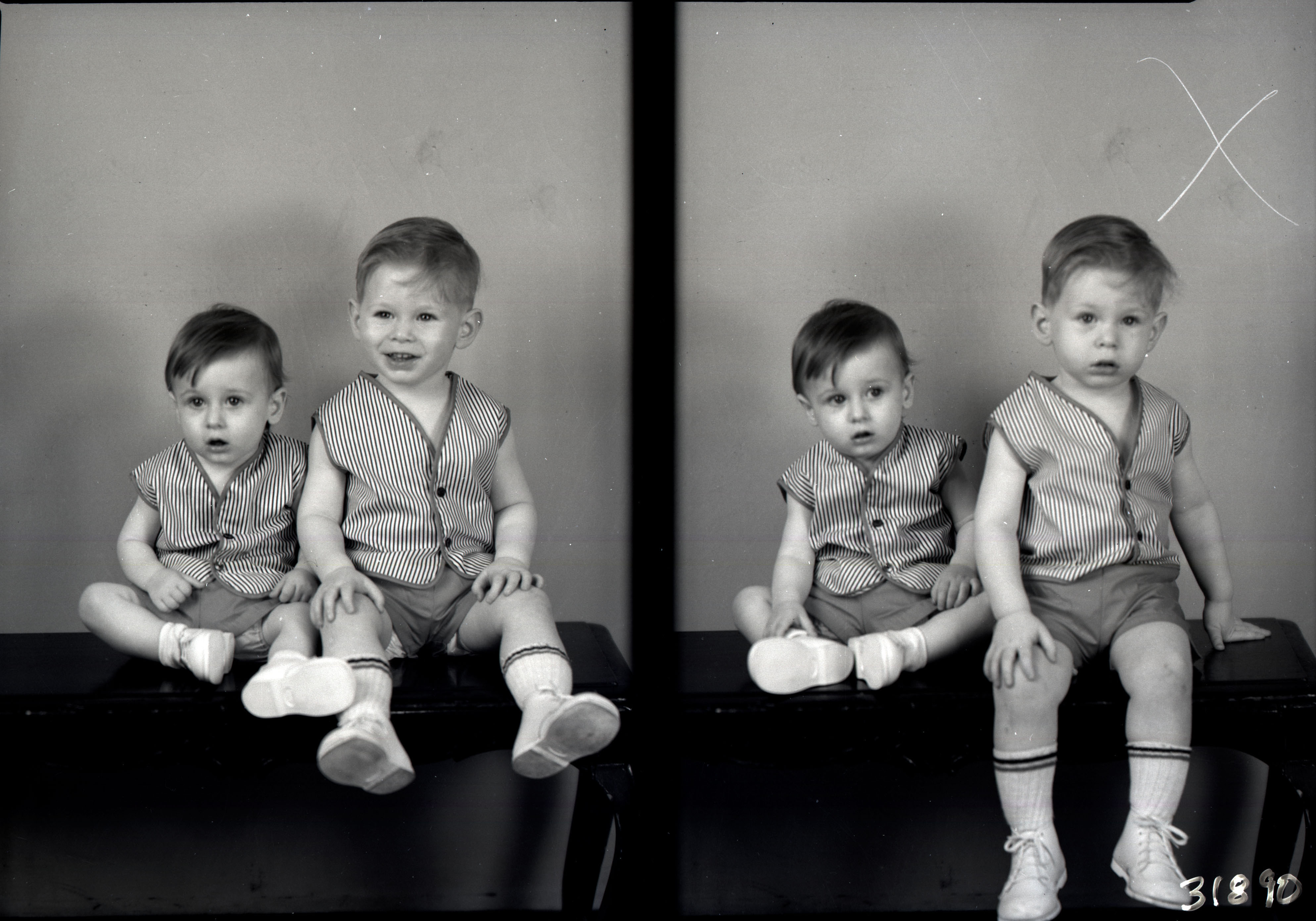 Photo of two separate photographs of the same unidentified two boys seated together and wearing matching shorts and striped tops.