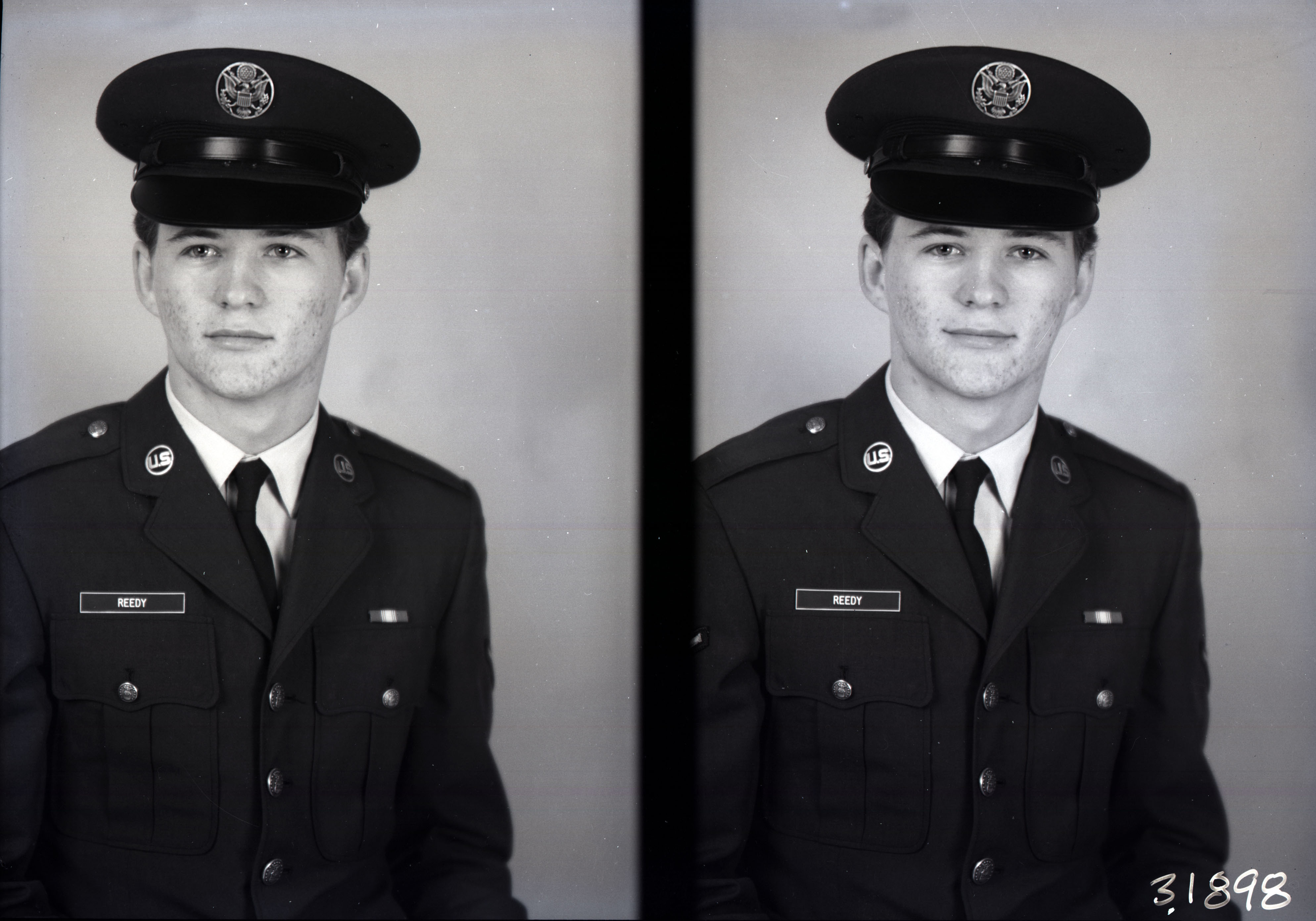 Photo of two separate portrait photographs of an unidentified young man wearing a U.S. Army uniform and cap. His name tag reads, "Reedy".