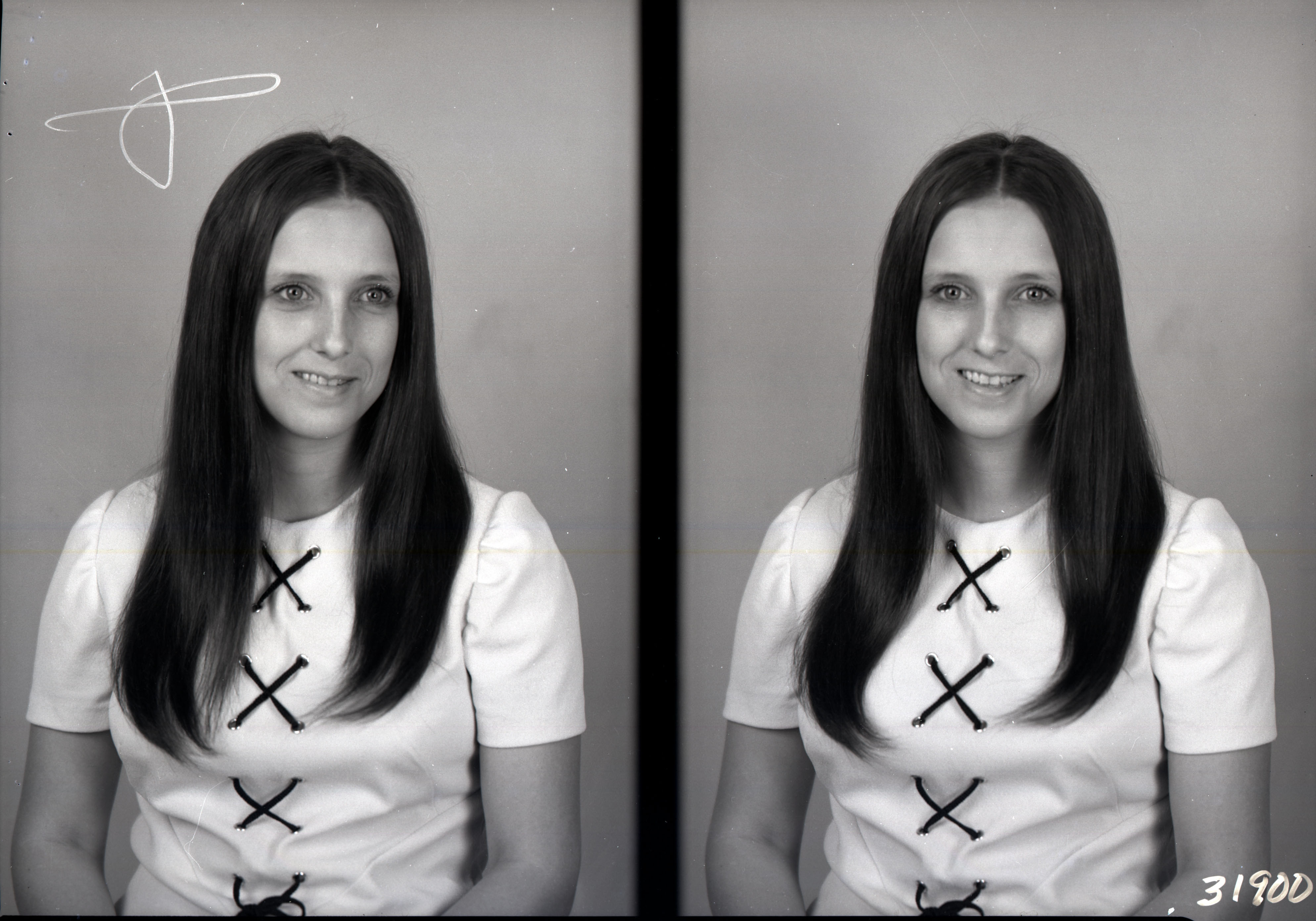 Photo of two separate portrait photographs of the same unidentified young woman with long straight hair. Her top has decorative lacing that forms dark "X"'s down the front.