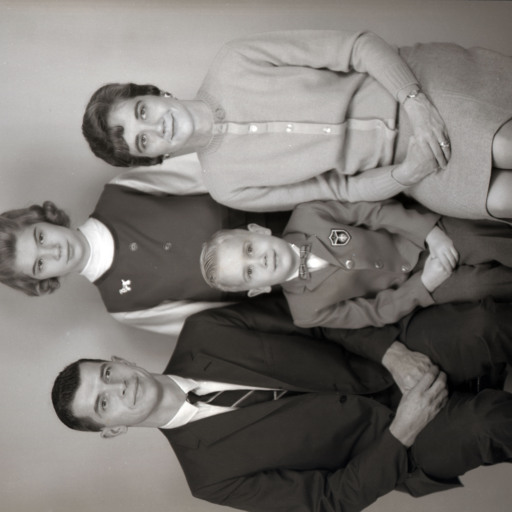 On the left, four unidentified men are standing together, all wearing boutonnieres on the lapel of their suits.