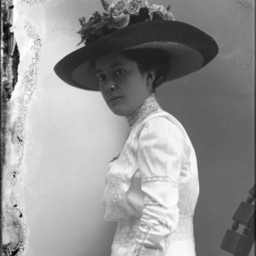 Unidentified woman is wearing a wide-brimmed hat decorated with flowers. She is photographed from the side with her face turned toward the camera.