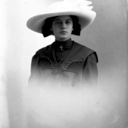 Portrait photograph of an unidentified young woman, possibly teen-aged, wearing a large wide-brimmed hat with a bow and a cross pin at her collar.