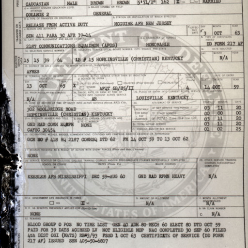 Bradley was originally from Trigg County, Kentucky and was born on 2 April 1939. When he was discharged, he was married.