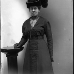 Unidentified older woman in pince-nez glasses is wearing a feathered hat and gloves. She is standing by a studio prop.