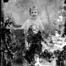 Unidentified little girl with short hair and bangs is seated on a chair.