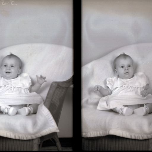 Photo of two separate photographs of the same unidentified young child shown on a covered wicker chair.