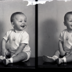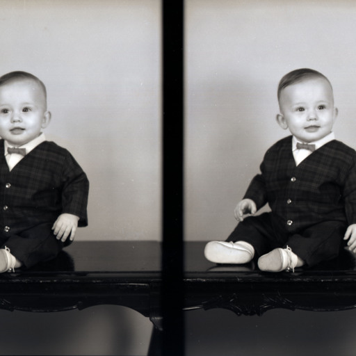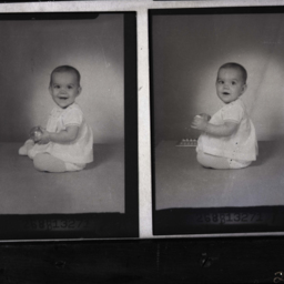Photo of two separate photographs of an unidentified young child seated on the lap of an unidentified woman whose face is partially cropped out of the images.