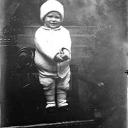 Photo of a photograph of an unidentified young child sitting in a high chair.